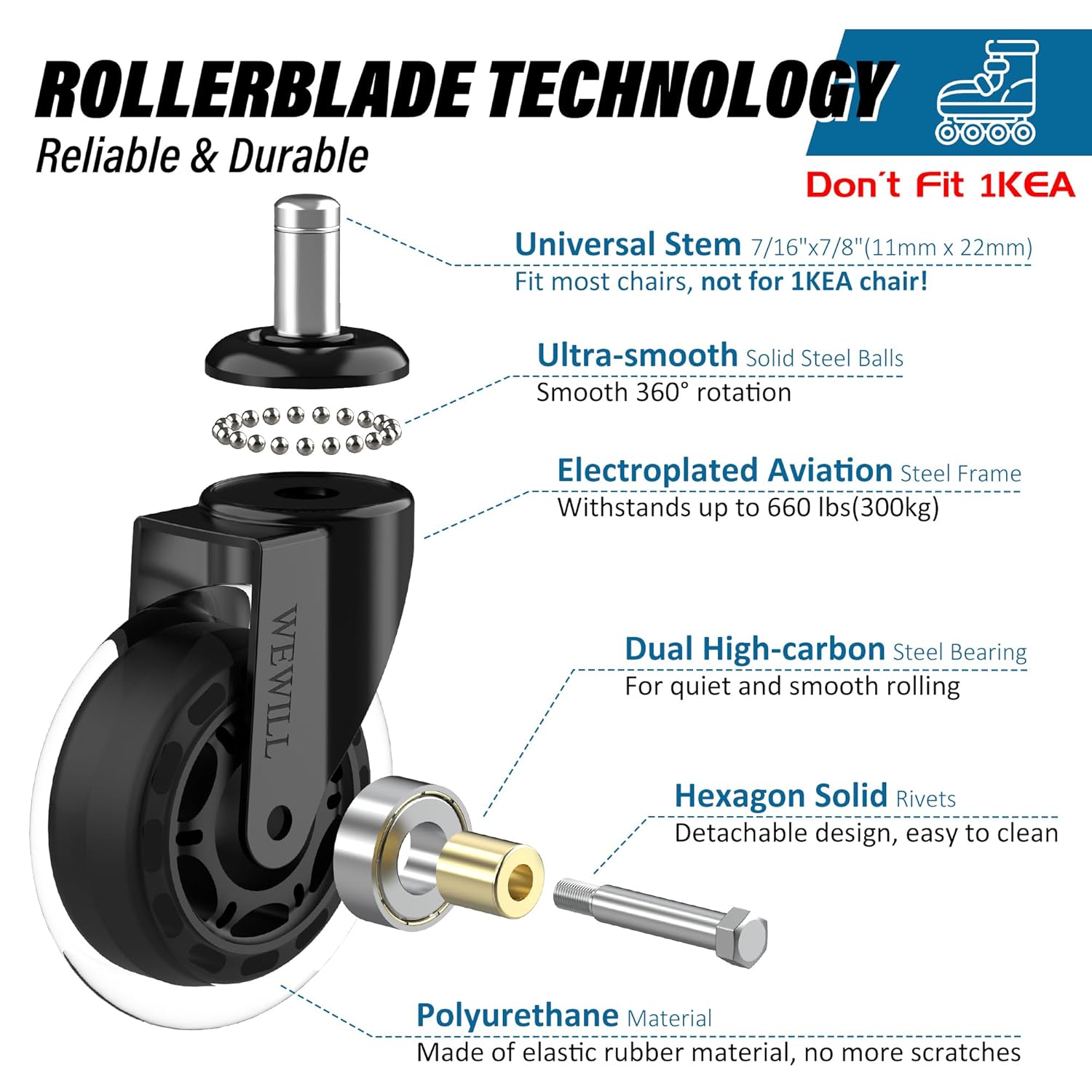 WEWILL Doppelrad-Bürostuhlrollen, super tragfähig, eingebaute Präzisionskugel, ausgewogener und stabiler.