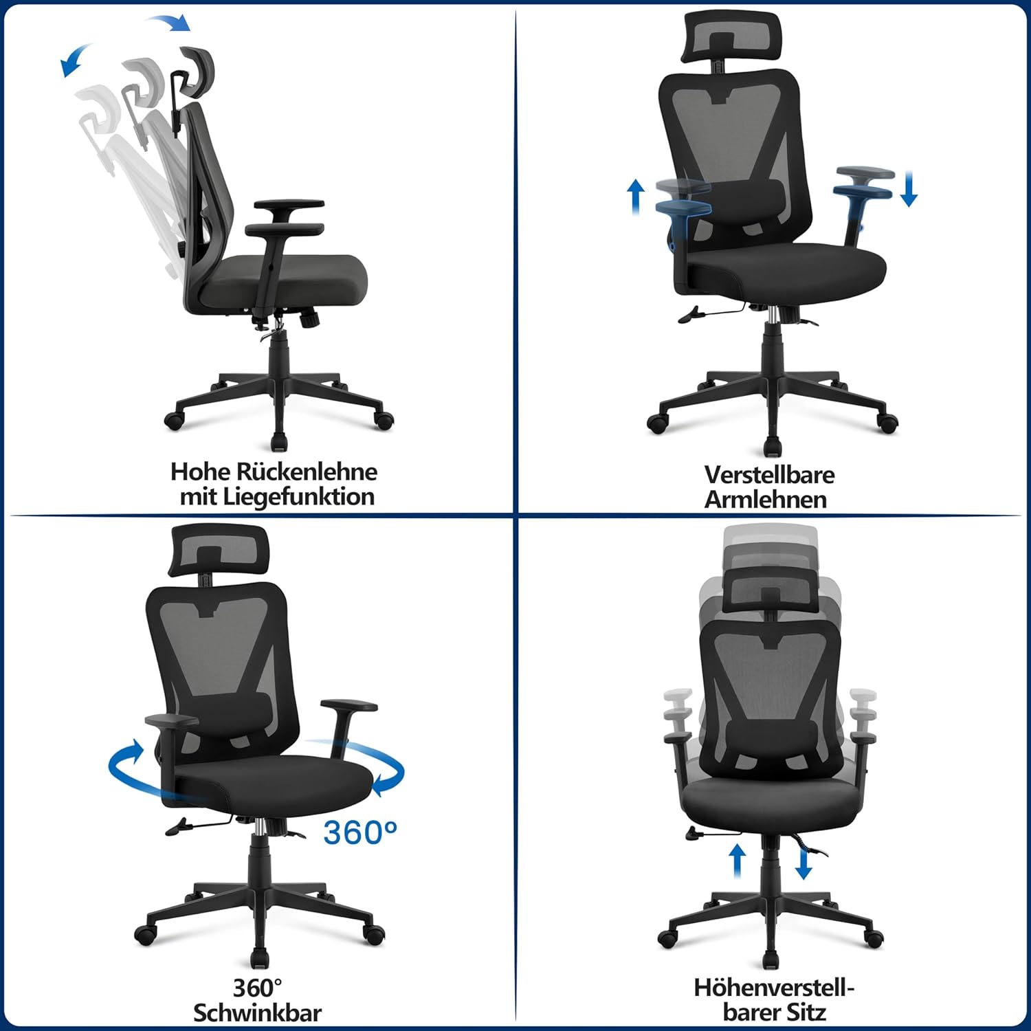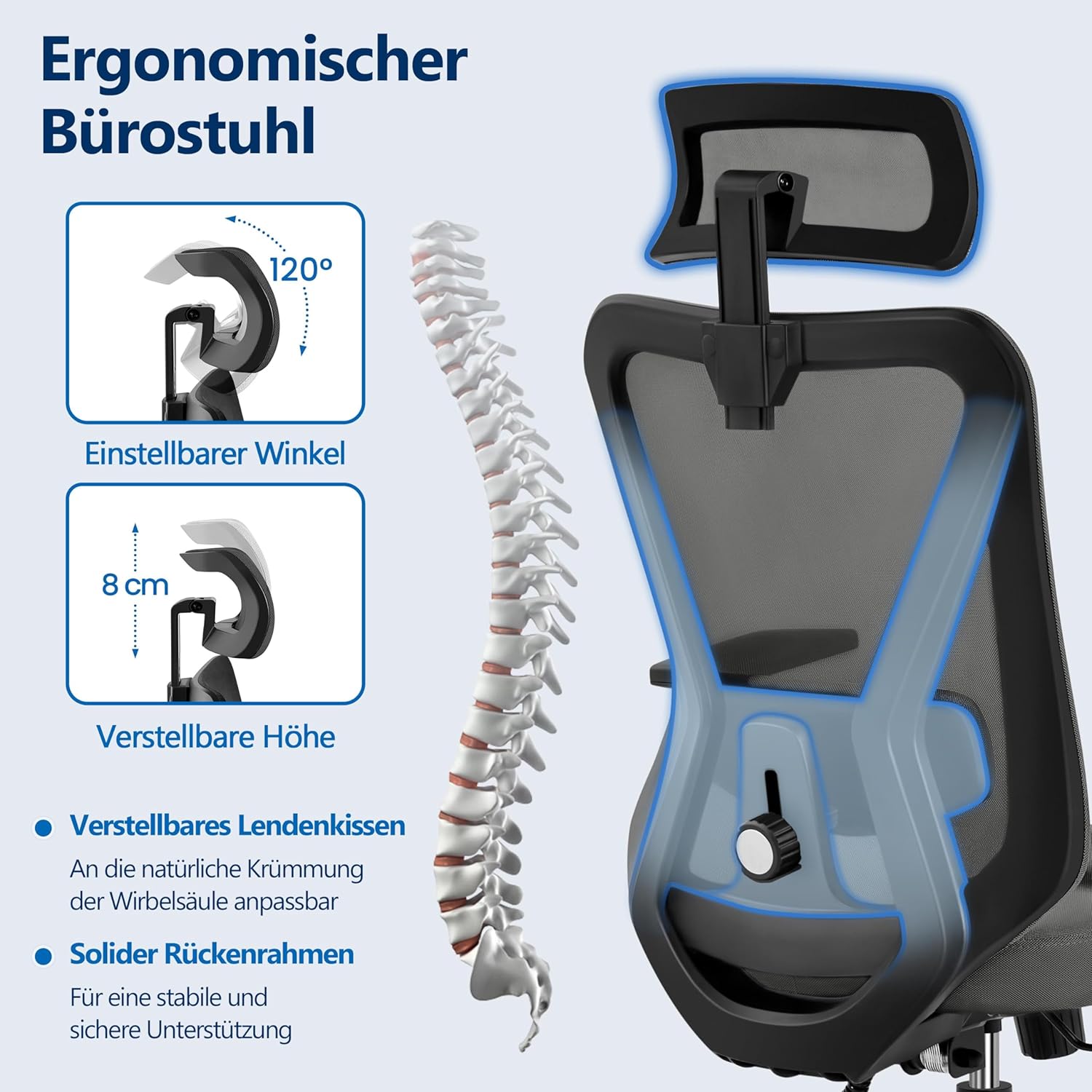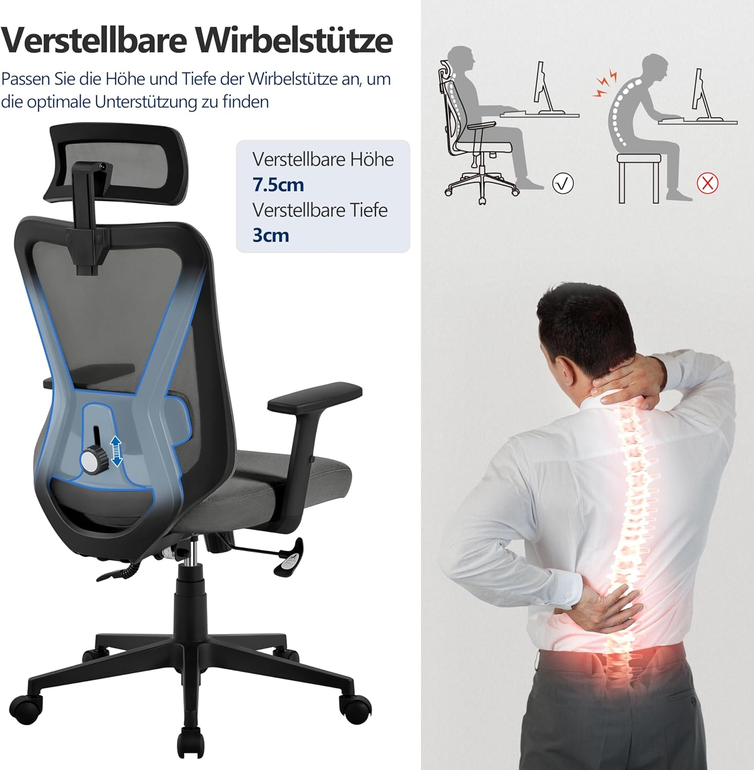 Ergonomisches Design für hohen Komfort: Dieser Bürostuhl passt sich jedem Körpertyp perfekt an und bietet eine verstellbare Kopfstütze, Armlehnen, Lordosenstütze, Neigungswinkel und Sitzhöhe. Die S-förmige Rückenlehne fördert eine bequeme Sitzhaltung und sorgt für bequemes Sitzen auch bei langen Arbeitszeiten