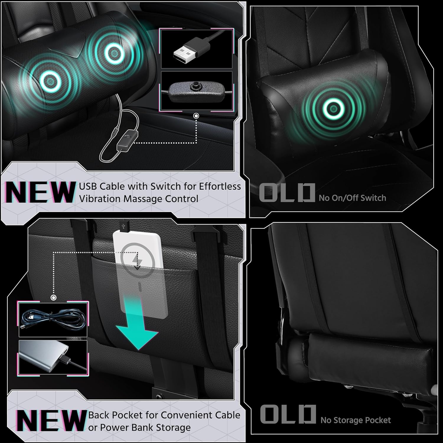 Gaming-Stuhl mit Massagefunktion Dieser Gaming-Stuhl verfügt über abnehmbare und verstellbare Lenden- und Nackenkissen. Drücken Sie den Schalter und genießen Sie nach einer intensiven Spielsaison die entspannende Massagefunktion