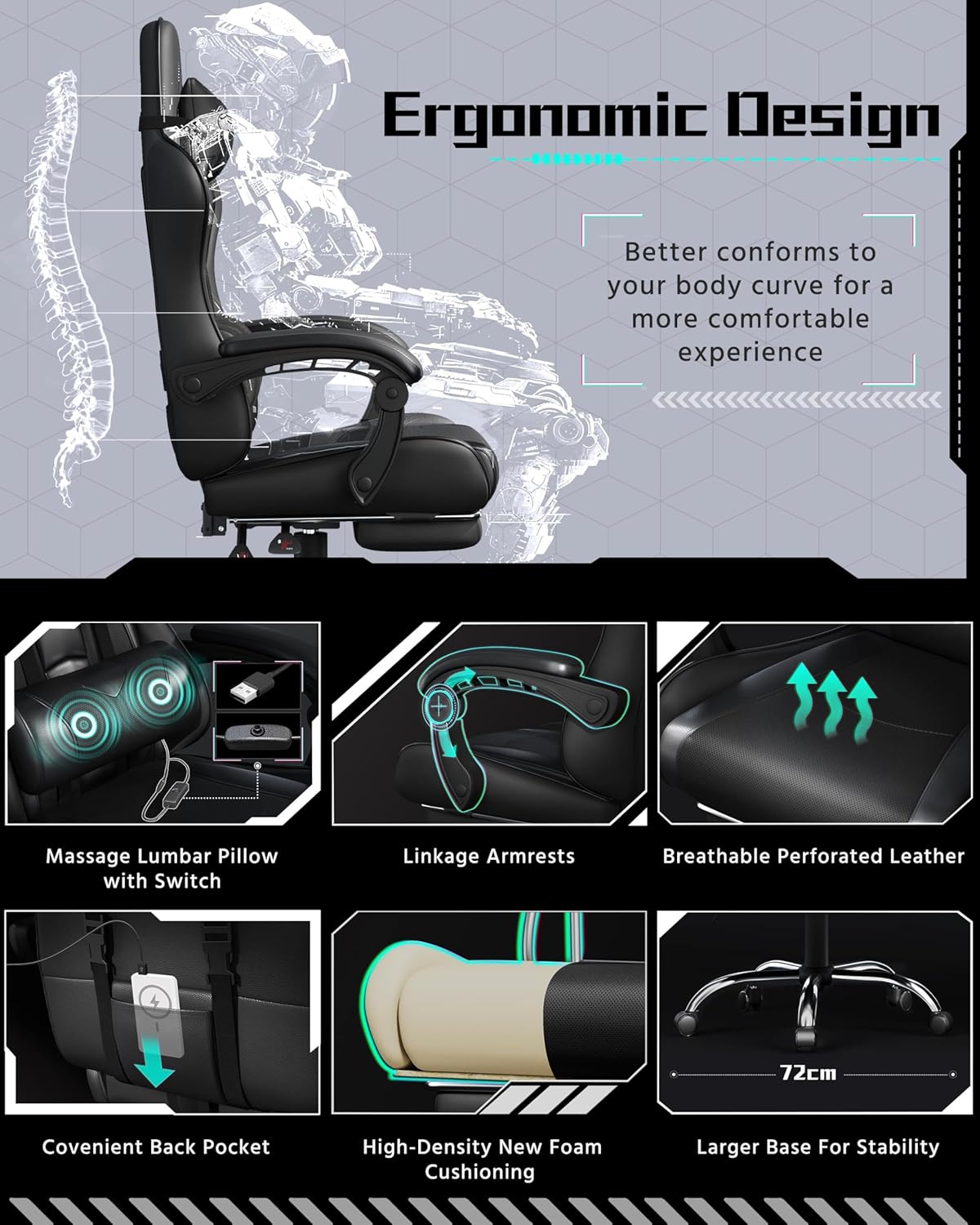 - 💺 Ergonomisches Design: Unterstützt Rücken & Haltung bei langen Gaming-Sessions