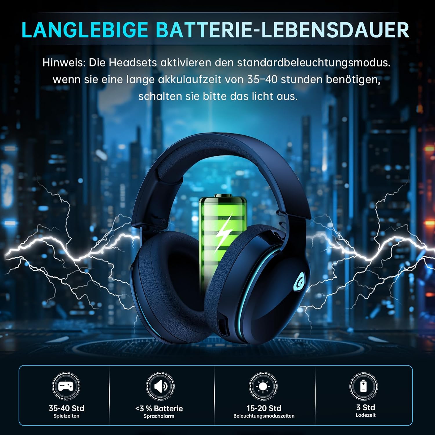 Ergonomisches Design und lange Akkulaufzeit: Gvyugke kabelloses Headset für Switch-Design, gepolsterte, verstellbare Kopfbänder, die nicht nur gut zur Reduzierung des Kopfdrucks sind, sondern auch für verschiedene Kopfformen geeignet sind. Die Ohren sind vollständig von weichen und atmungsaktiven Memory-Protein-Ohrenschützern bedeckt, die Geräusche effektiv isolieren und lange Gaming-Sessions ohne Ermüdung ermöglichen. Audifonos Gamer hat eine nachhaltige Spielzeit von 35-40 Stunden. Mit coolem RGB-Lichteffekt (15–20 Stunden). Vollständige Aufladung in nur 3 Stunden.