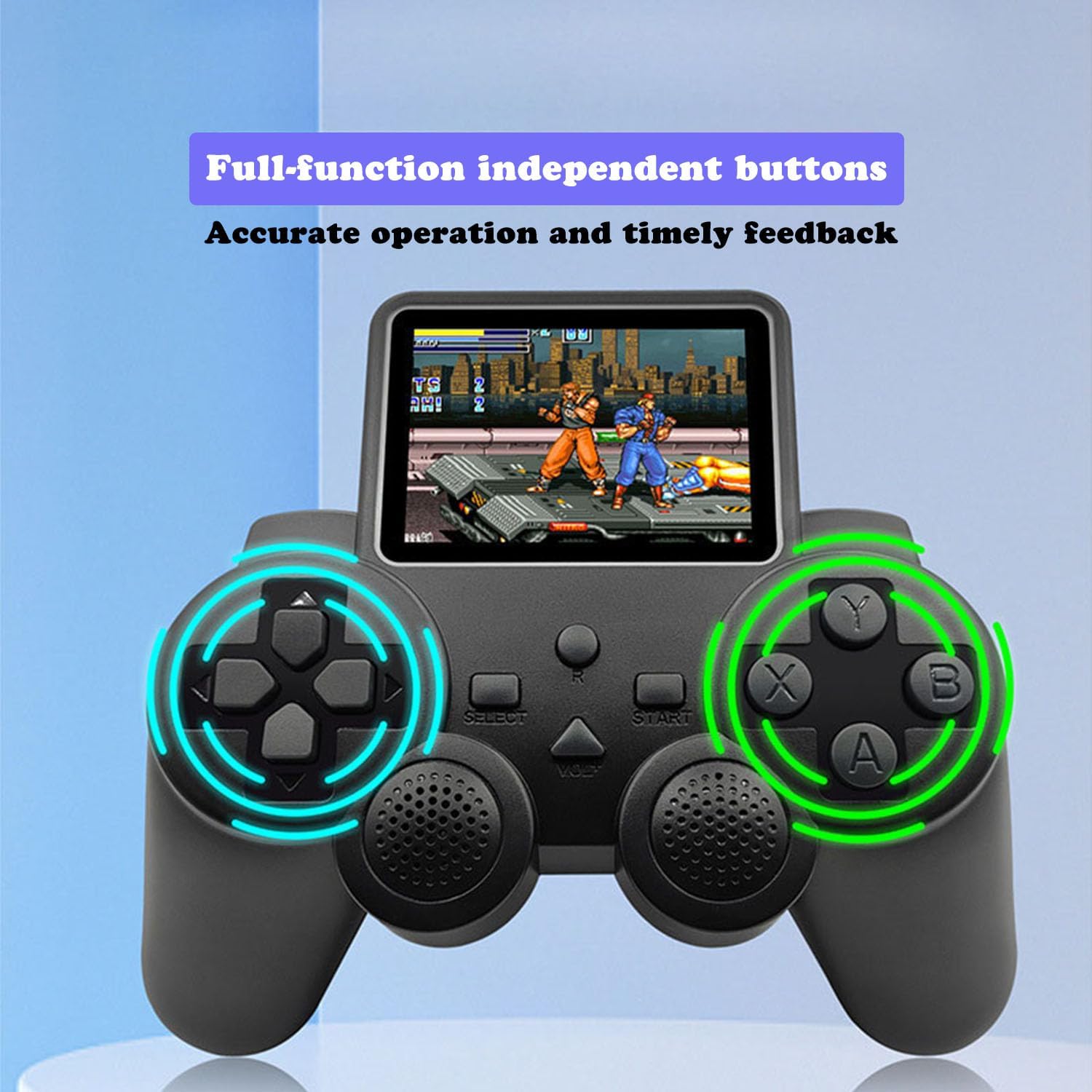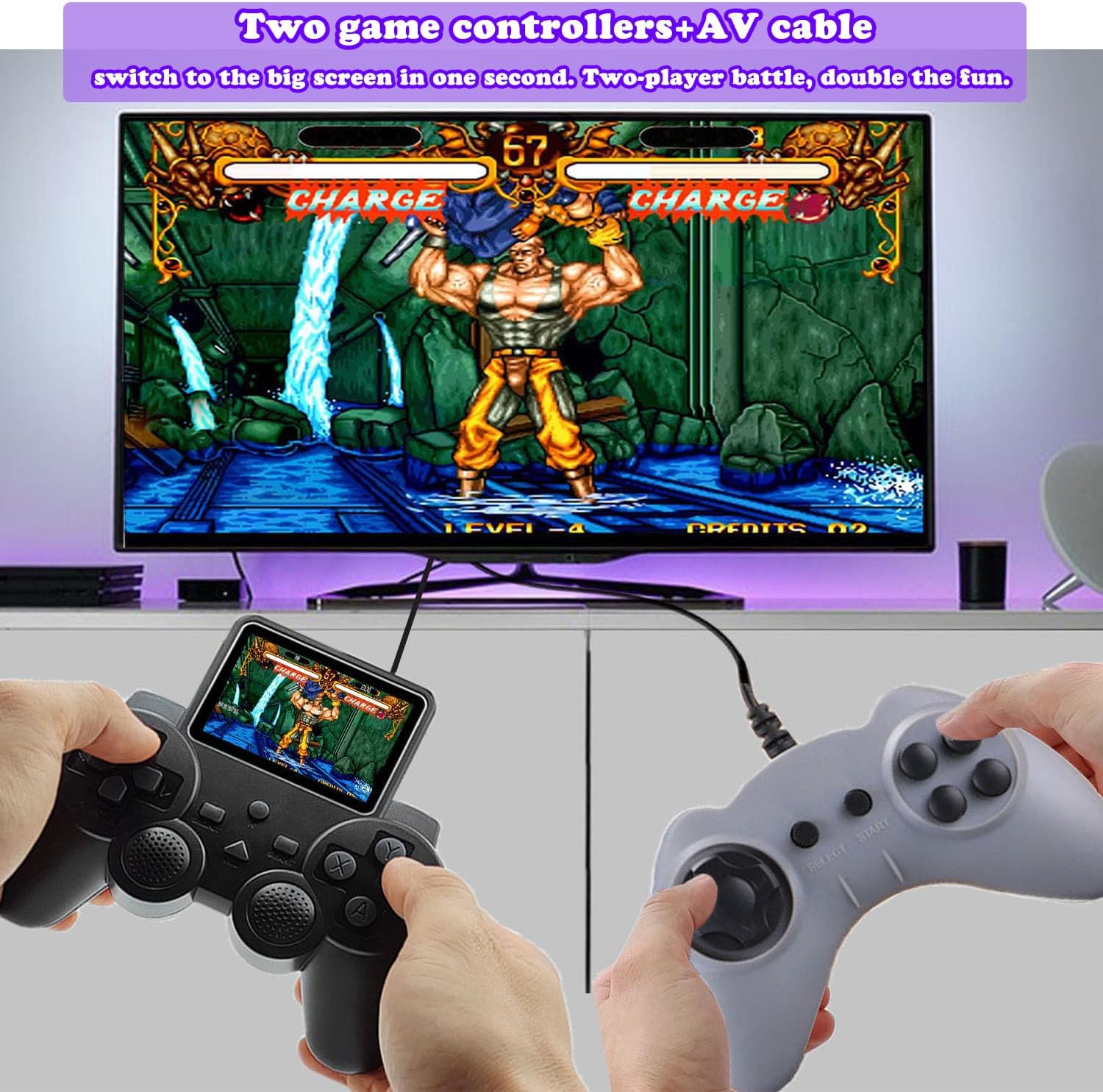 TV-Ausgang und Zwei-Spieler-Modus: Die Retro-Videospielkonsole verfügt über einen 3-Zoll-Farbbildschirm mit hoher Helligkeit, der Spielszenen und Details perfekt wiederherstellt und Sie sofort in Ihre Kindheit zurückversetzt. Es unterstützt die HD-TV-Ausgabe, sodass Sie in den Großbildmodus wechseln und Ihr Wohnzimmer in ein nostalgisches Gaming-Center für die ganze Familie verwandeln können. Sie erhalten zwei Gamepads für den Koop-Modus mit zwei Spielern, wodurch sie sich perfekt für Partys oder Campingausflüge eignen, um jederzeit einen unterhaltsamen Kampf zu beginnen.