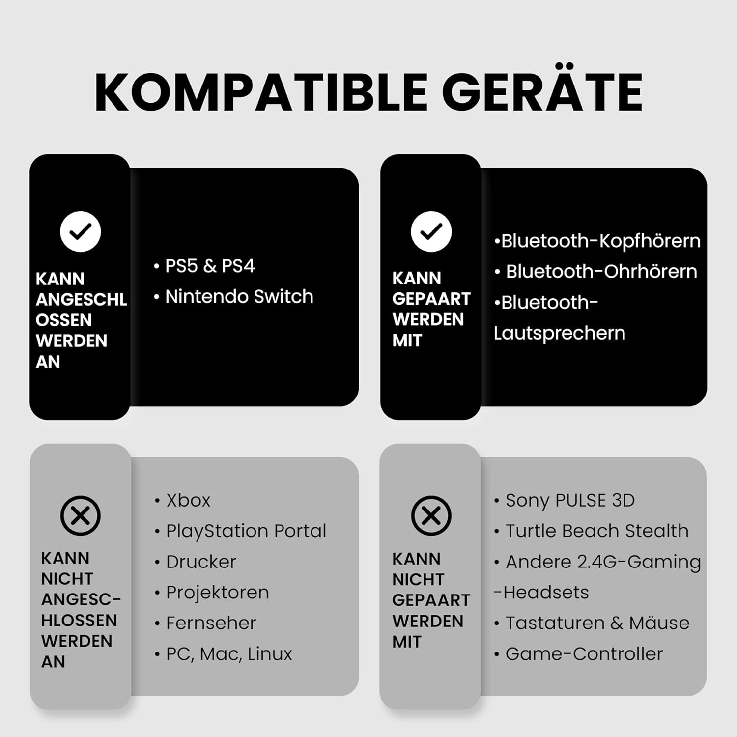 Funktioniert mit PS5, PS4, Switch-Konsole; verbindet sich mit Bluetooth-Kopfhörern, Ohrhörern, Lautsprechern.