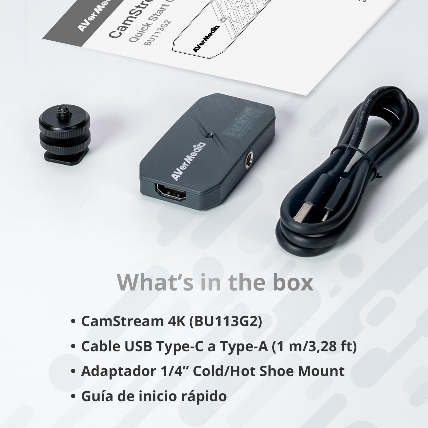 Lieferumfang: CamStream 4K (BU113G2), USB-C-auf-A-Kabel (1 m), 1/4-Zoll-Kalt-/Blitzschuhadapter, Kurzanleitung.