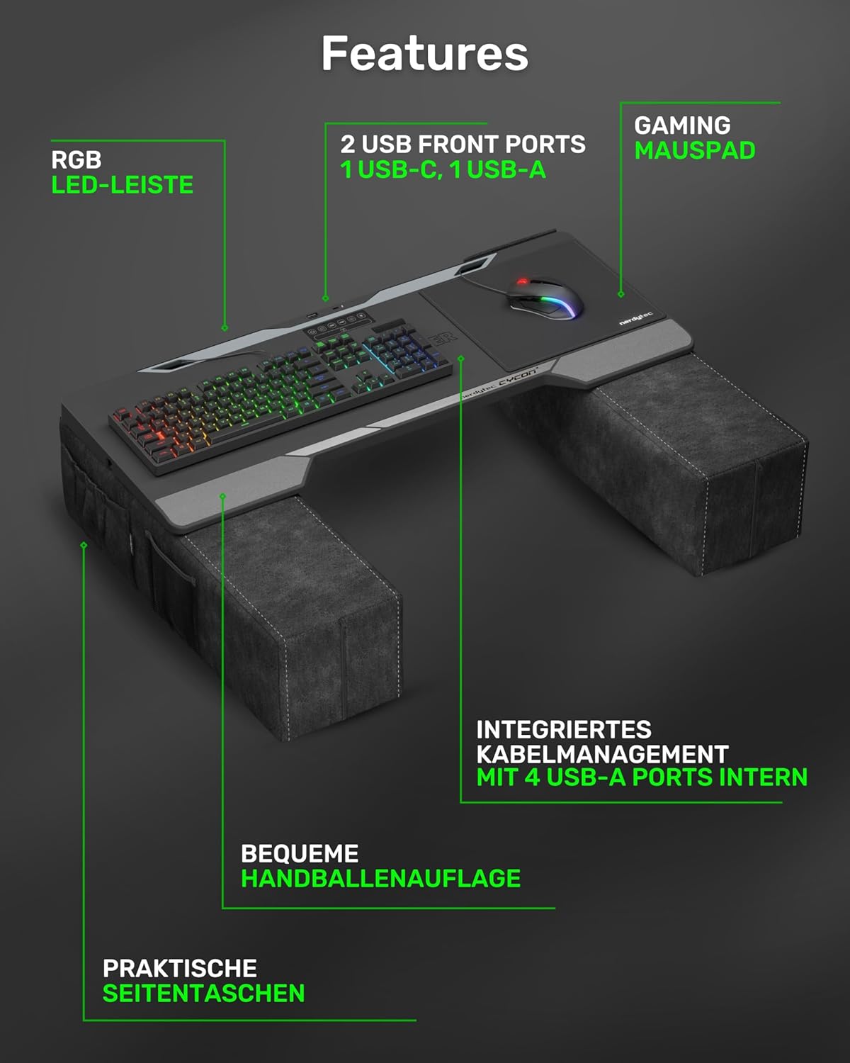 Das Kissen ist nicht fixiert und kann frei bewegt werden. Achtung: Benutzen Sie den Klettverschluss auf der Platine nur für das Mauspad oder die Tastatur.