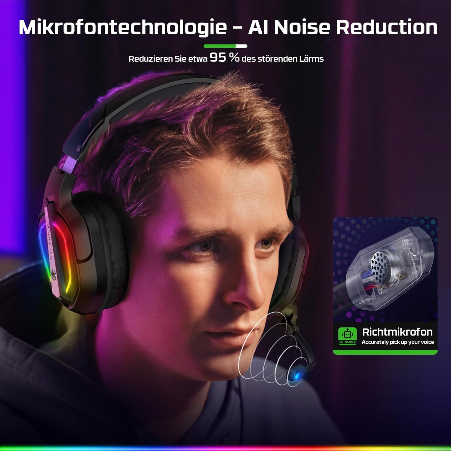 Einstellbares Mikrofon mit Rauschunterdrückung: Das eingebaute omnidirektionale Mikrofon des Fachixy-Headsets für PS5, PS4 überträgt mit seiner hervorragenden Rauschunterdrückung hochwertige Kommunikation. Es kann Geräusche sehr empfindlich erkennen und unterdrücken und sorgt so für einen klaren Klang im Spiel. Das lange und flexible Mikrofondesign kann den Winkel des Mikrofons um 120° drehen.