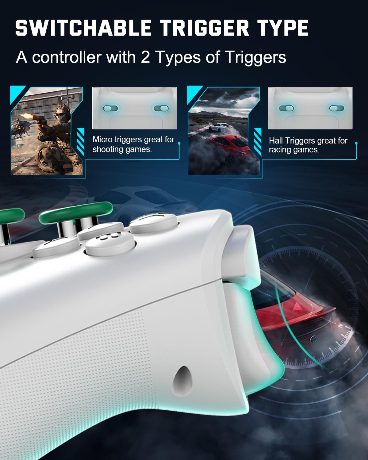 Mikro-Trigger + Hall-Trigger-Umschaltung: Lösen Sie Trigger-Optionen für verschiedene Spieltypen, mit Doppelschalter, um den Modus des linken und rechten Triggers entsprechend anzupassen. Micro-Trigger eignen sich für die sofortige Auslösung im Kampf und beim Schießen, der Hall-Trigger eignet sich für leichte und starke Pedalbeschleunigungen in Rennwagen