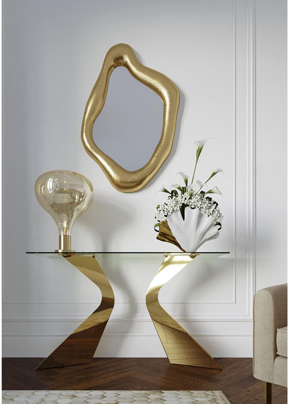 Gold glänzende Konsole: Luxuriöse Konsole mit glänzender Glasplatte und skulpturalem Rahmen aus verzinktem Edelstahl als stilvolle Einrichtungslösung für den Flur