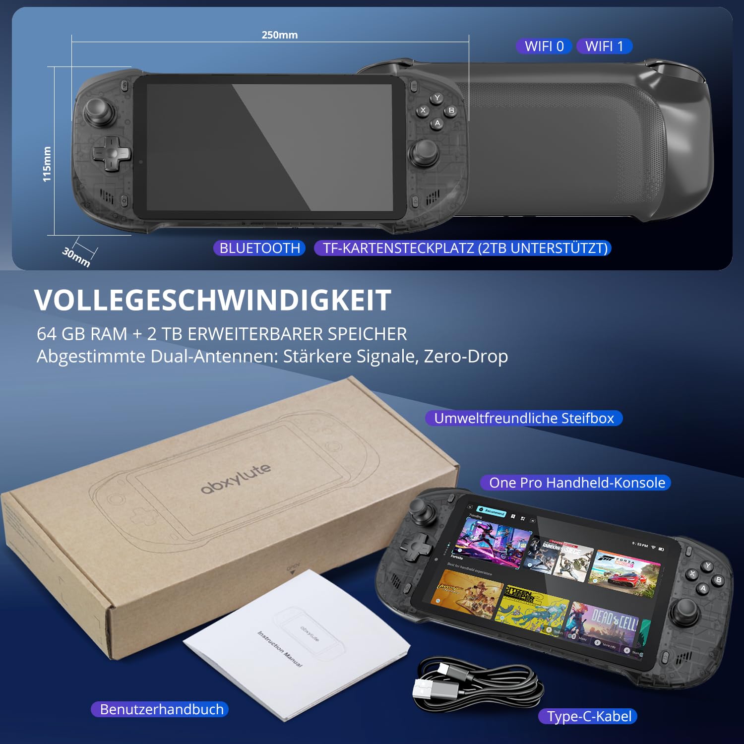 Verbesserter Chipsatz für minimale Latenz: Mit einer deutlichen Leistungssteigerung dank MediaTek Genio 510 und einem 2T2R MU-MIMO WiFi-Modul führt das abxylute One Pro anspruchsvolle Spiele flüssiger und schneller aus – egal ob Streaming, Emulation oder lokales Spielen. 300 % Leistungssteigerung im Vergleich zur ersten Generation. Android, PC, Xbox & Cloud Gaming überall – Egal, ob Sie Halo, Fortnite, Diablo oder Roblox spielen, mit dem abxylute One Pro haben Sie Zugriff auf eine riesige Spielebibliothek. Spielen Sie direkt von Google Play oder streamen Sie PC- und Xbox-Titel von zu Hause oder aus der Cloud.