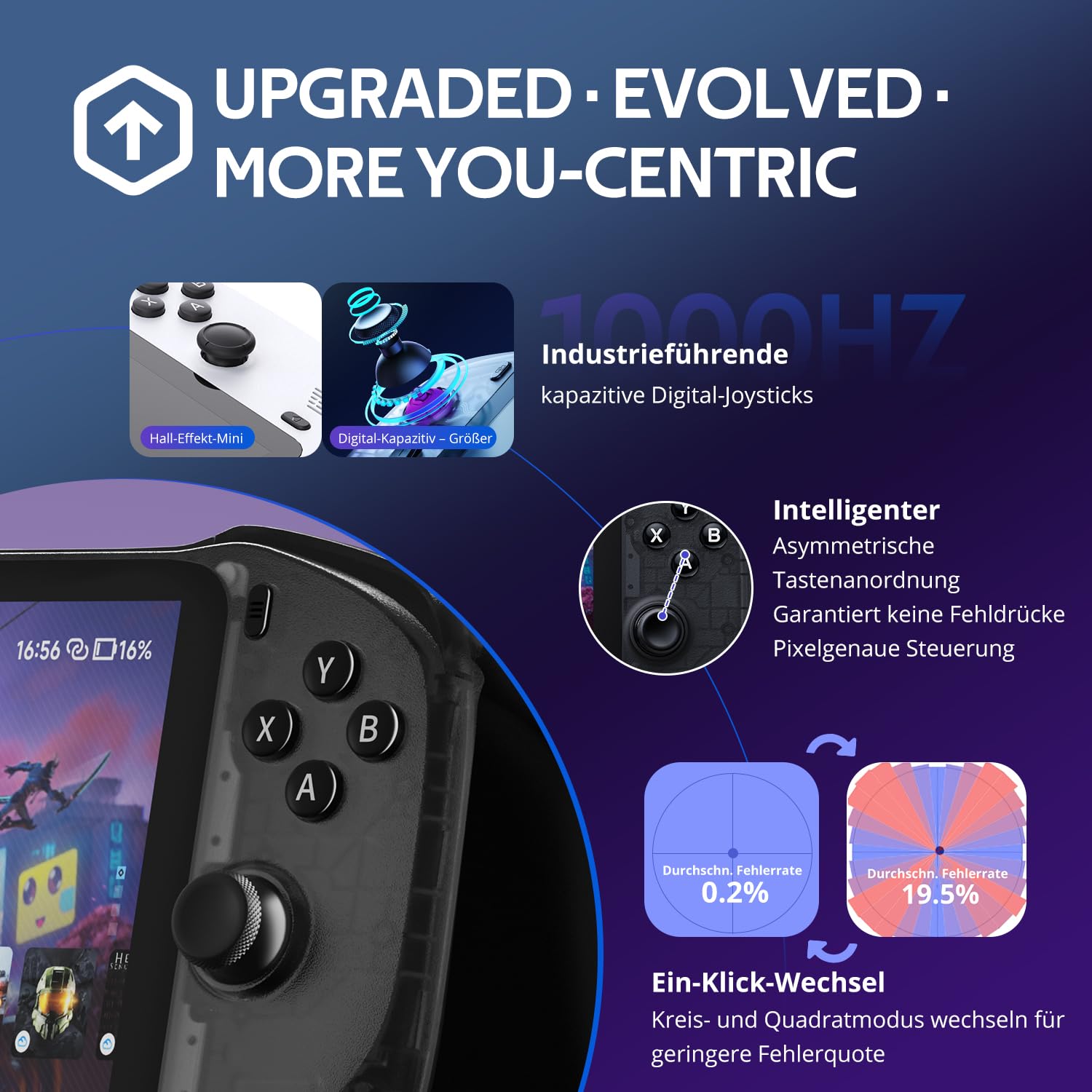 Kondensator-Digital-Joystick + umschaltbare Modi: abxylute One Pro ist der erste Handheld mit hochmodernen digitalen Joysticks – höher, größer und fortschrittlicher mit erweitertem Eingabebereich. Wechseln Sie zwischen dem Kreismodus für ultrapräzises 0,2 %-Tracking oder dem Quadratmodus für eine breitere Eingabe – angepasst an verschiedene Spielstile.