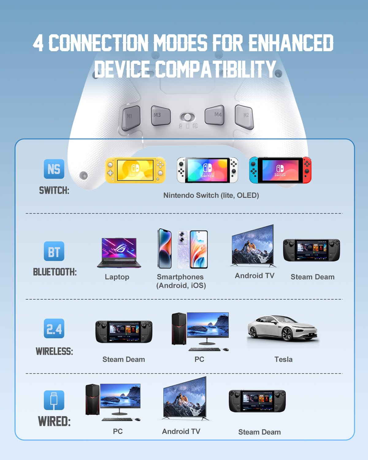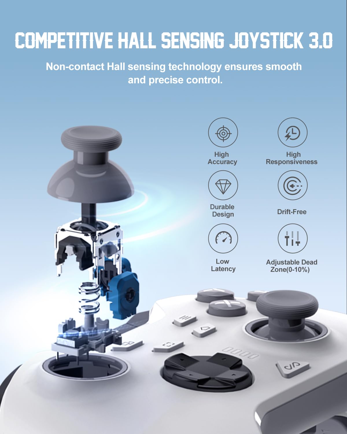 2025 upgrade gaming controller: with hall joystick, 4 macro buttons, 3 connection modes (2.4G/Bluetooth 5.2/switch), 2-stage trigger lock, FN button, POM rings, vibration feedback, 1000 mAh battery, app adjustment tool and 6-axis gyroscope. Compatible with PC, Switch, Android and iOS.