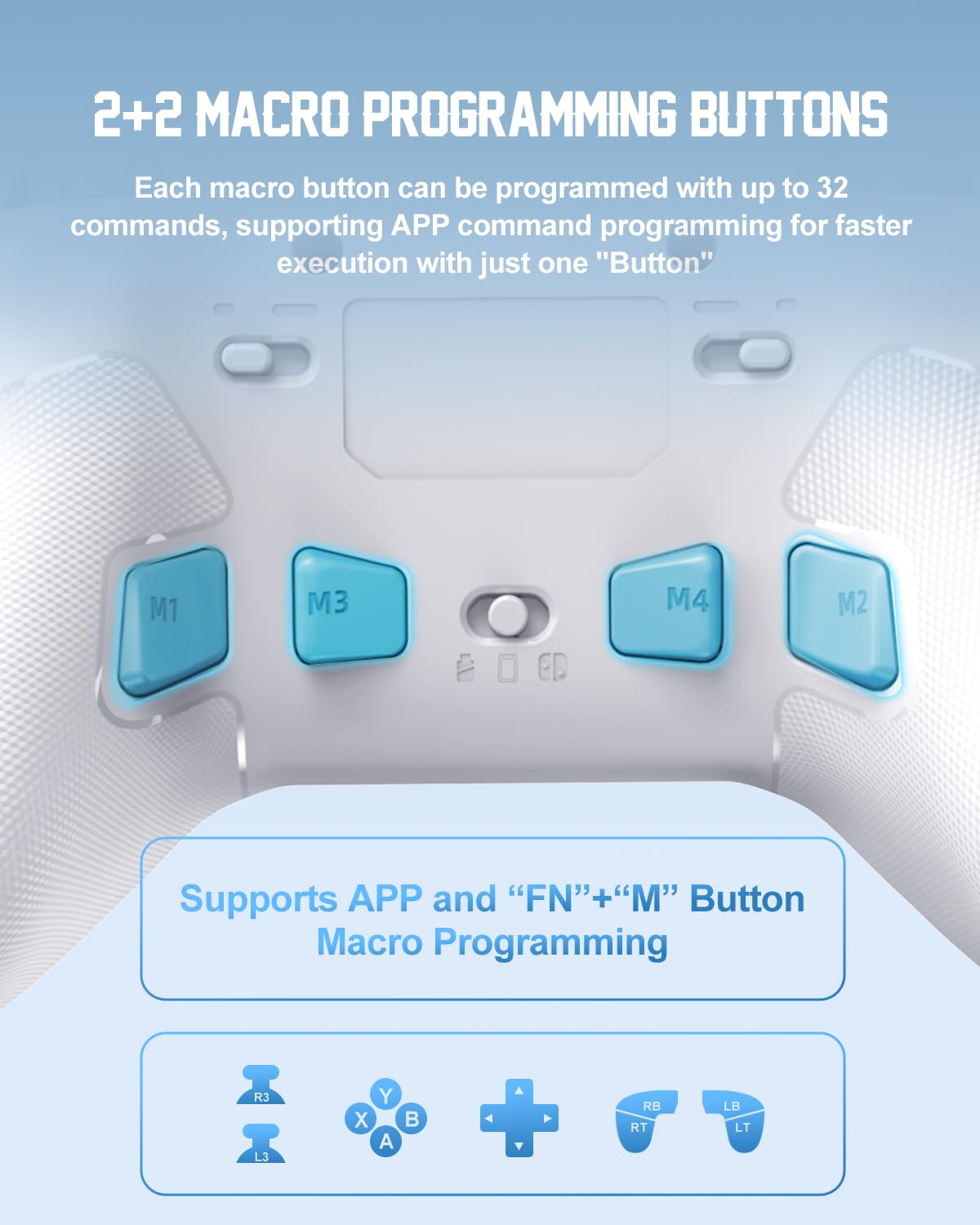 Upgraded technology: Hall joystick: Hall effect sensor for precise control, eliminates drift. Supports switching between round and square mode for the joystick as well as adjustment of the dead zone. ● 4 programmable macro keys: fully customizable for complex operations. ● Hall linear trigger: 256 level precision for linear input. ● 2-stage trigger lock: adjustable for linear or non-linear trigger modes. ● FN button: Support function adjustment.