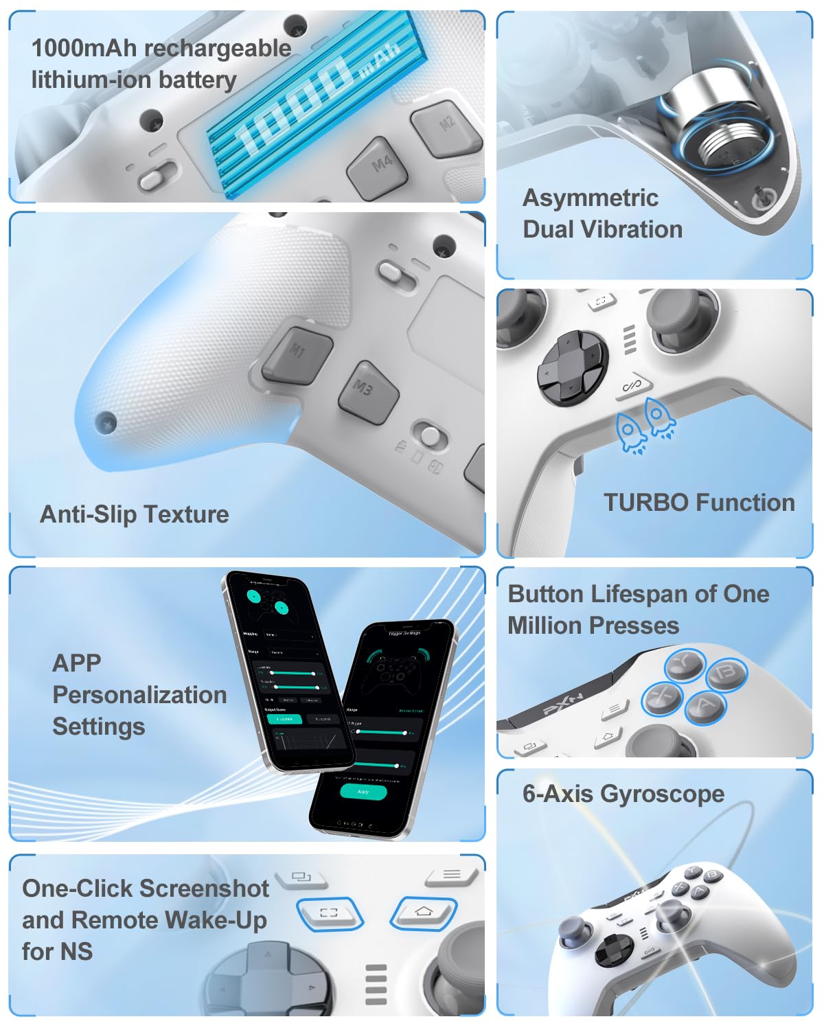 Other features: 1000 mAh rechargeable Li-polymer battery. App support: allows you to adjust macro settings, button assignments, vibration intensity, joystick settings and more. ● 6-Axis Gyroscope ● POM Rings: Improve the durability of the joystick and ensure even smoother operation. ● Asymmetrical dual motors vibration feedback.● One-button wake up for switch consoles.