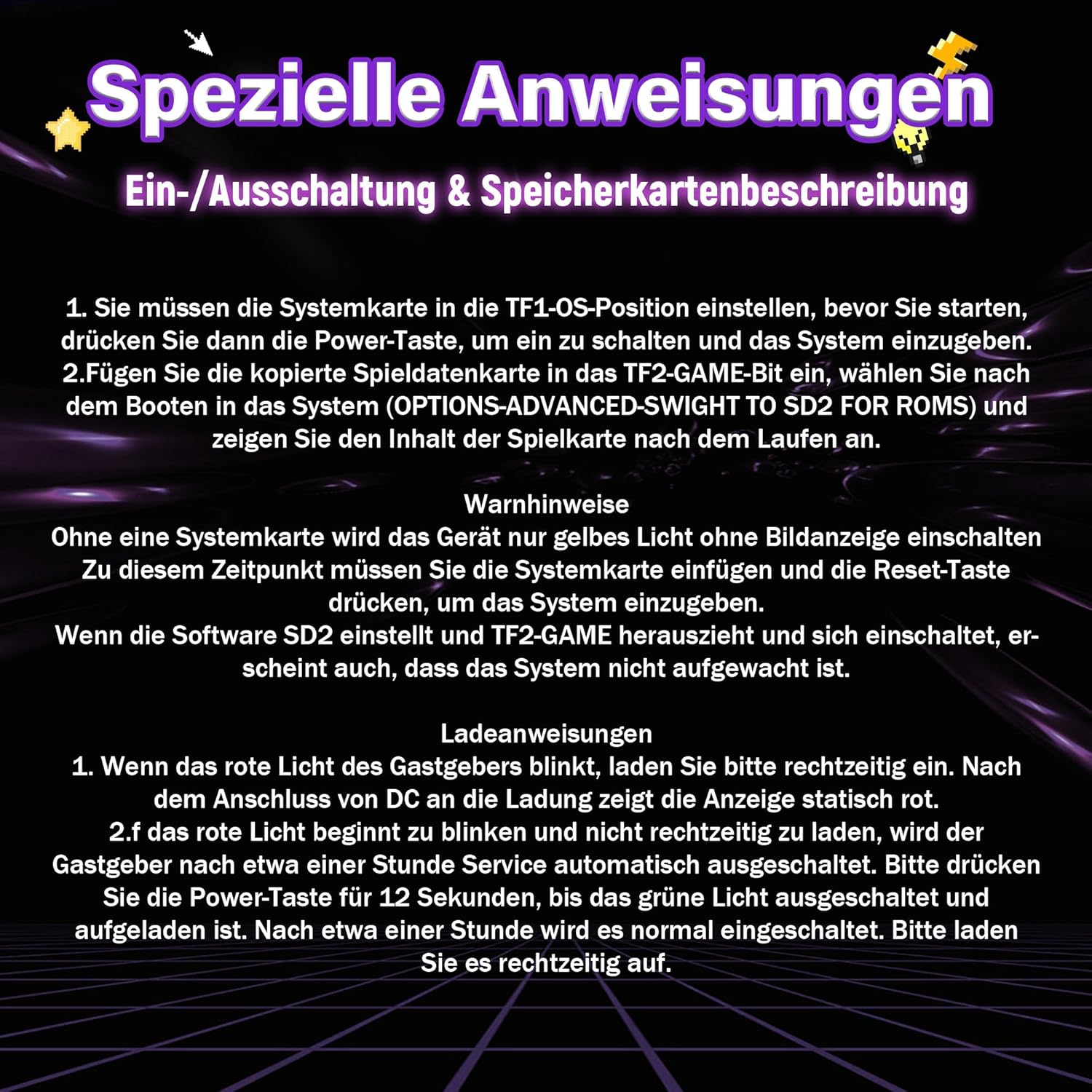 Pflege der SD-Karte: Entfernen Sie die TF/SD-Karte nicht direkt und formatieren Sie sie nicht – alle Spieldateien und Systemdaten werden darauf gespeichert. Eine Beschädigung oder Formatierung der Karte macht die Retro-Handkonsole unbrauchbar. Die SD-Karte ist bei Erhalt des Produkts im Steckplatz vorinstalliert, Sie müssen sie nicht selbst einlegen.