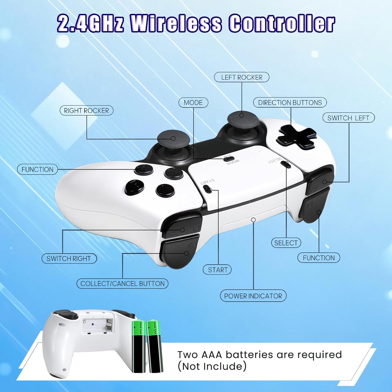 Beim Anschließen müssen Sie den Empfänger des Controllers an den Gamestick anschließen und ihn mit Strom versorgen. Legen Sie die Batterie in den Controller ein und schalten Sie den Schalter ein. Wählen Sie den entsprechenden HDMI-Eingang als Anzeigesignalquelle. Für eine stabile Verbindung zum Controller empfehlen wir, andere Bluetooth-Geräte während des Spiels auszuschalten, um Signalstörungen zu vermeiden.