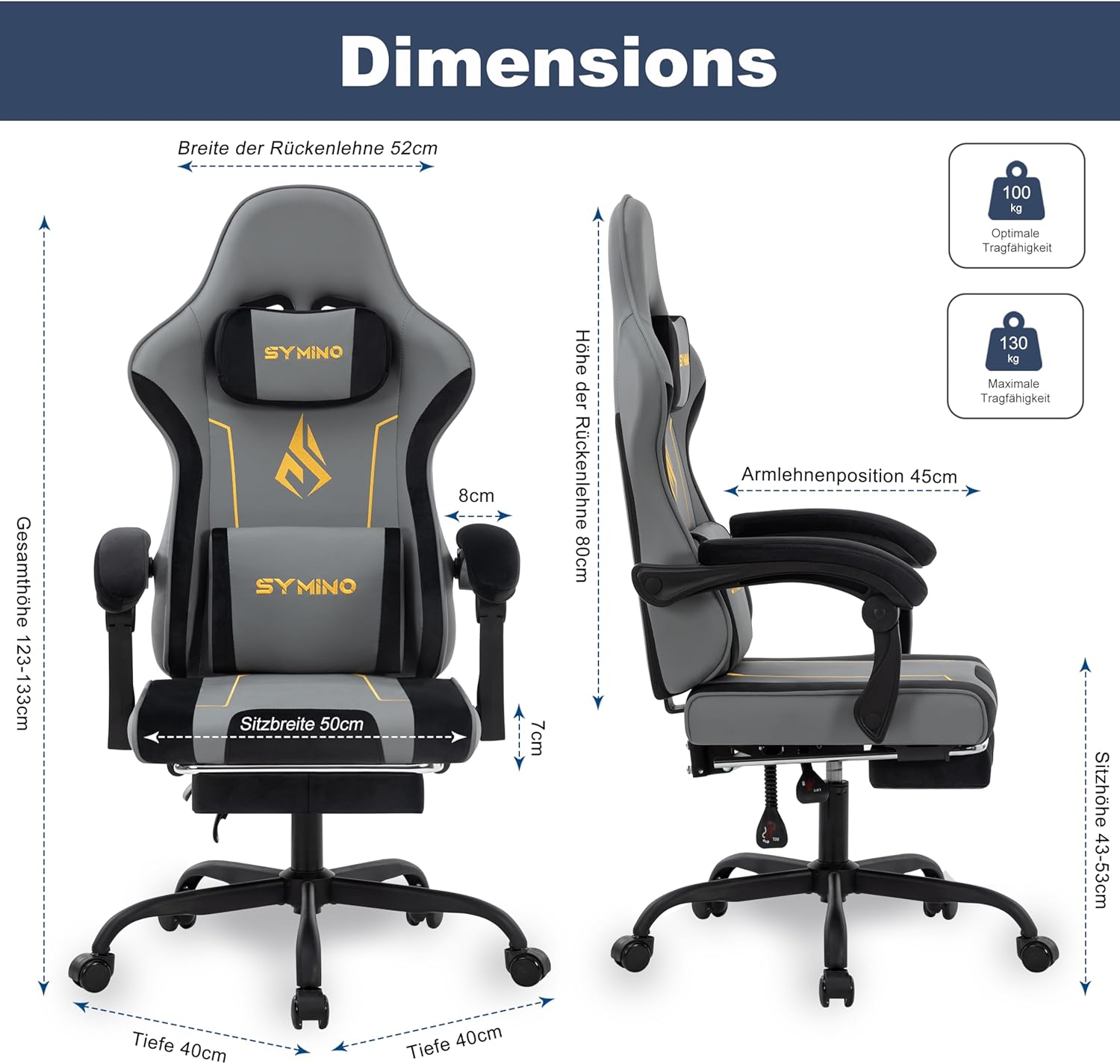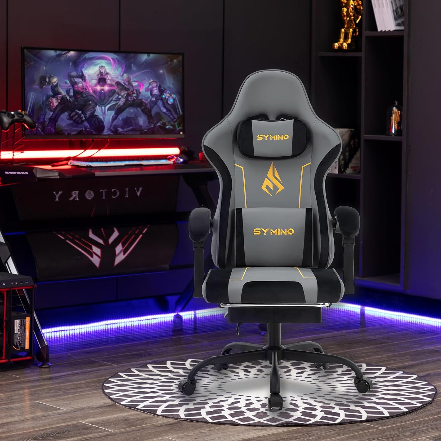 Symino Gaming Chair with Latex Backrest and Seat Cushion, Ergonomic Office Chair, Racing Chair Design, PC Chair, Adjustable Rotating Task Chairs with Footrest 130 kg, Grey/Black
