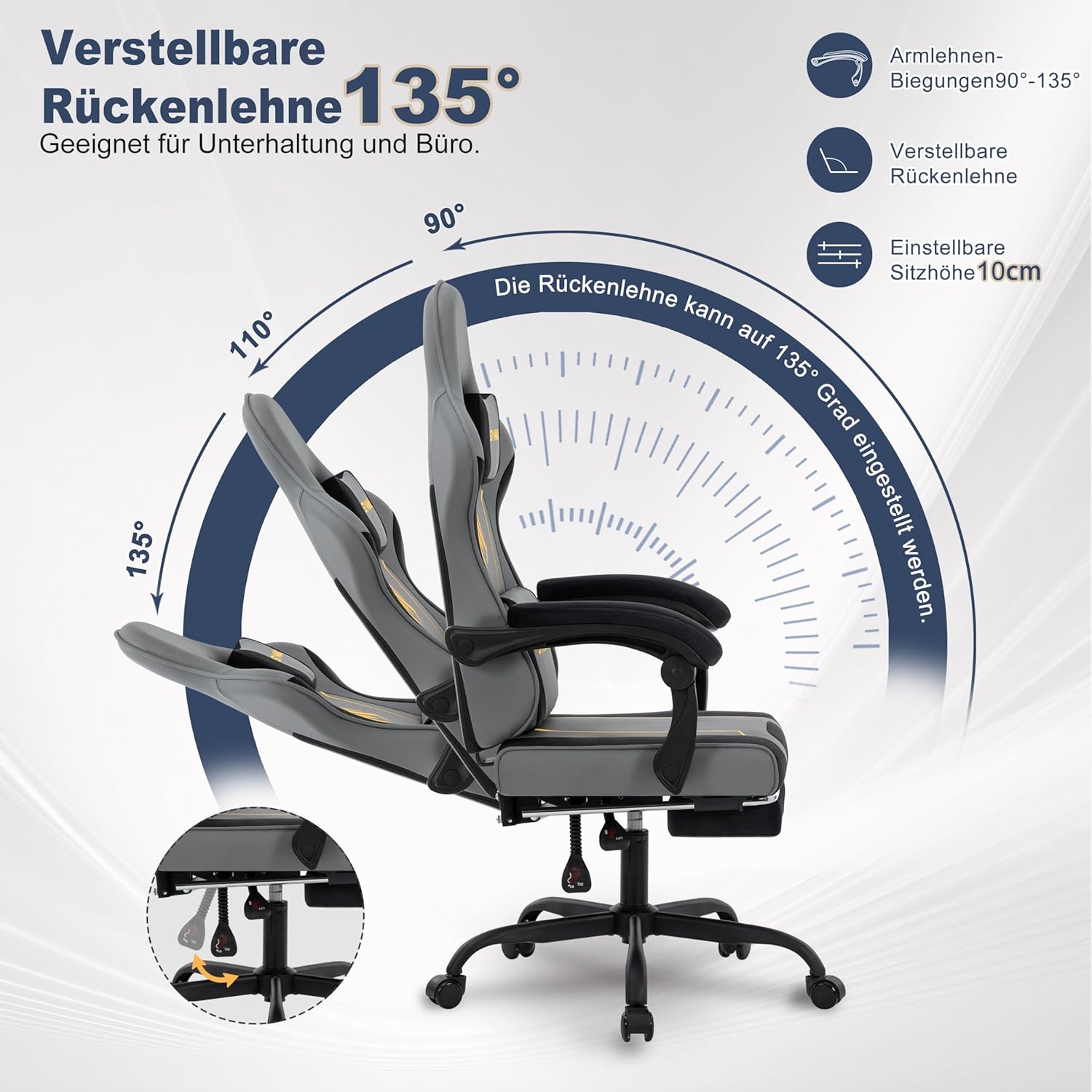 360°-Drehung und Höhenverstellung Der Stuhl bietet eine 360°-Drehung, die eine flexible Anpassung des Betrachtungswinkels an unterschiedliche Bedürfnisse ermöglicht. Die Sitzhöhe lässt sich um 10 cm verstellen, sodass jeder die ideale Sitzposition finden kann.