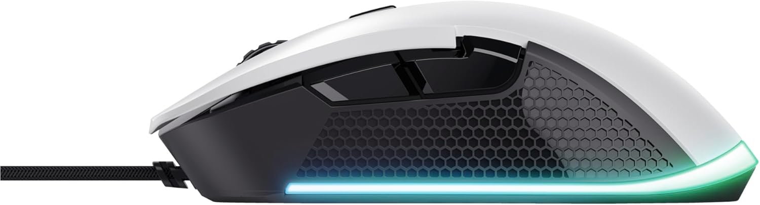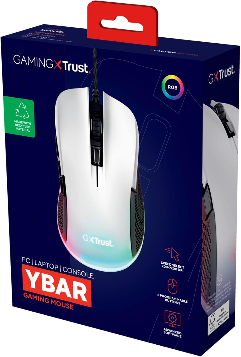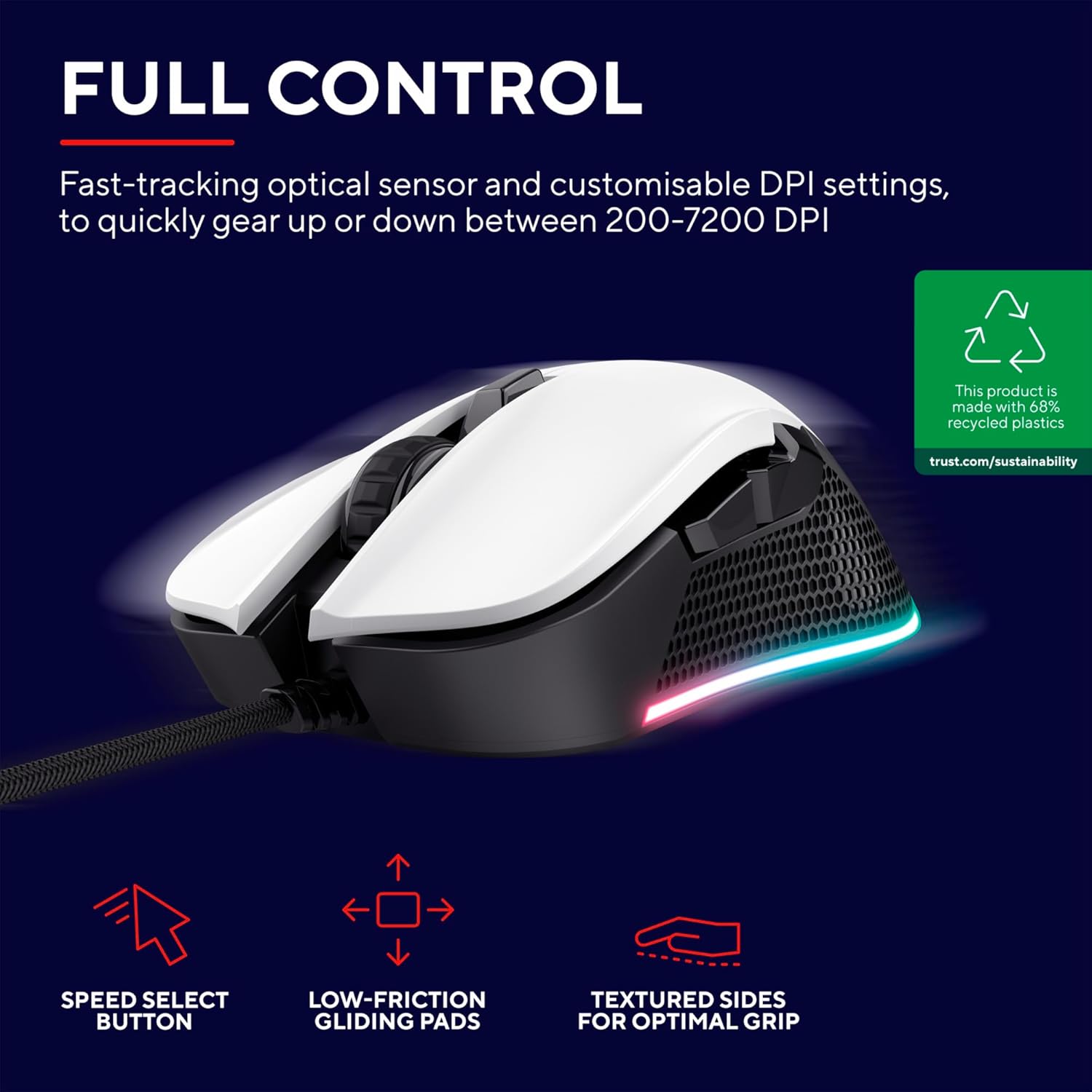 Trust Gaming GXT 922W Ybar Gaming Maus, 68% Recycelten Materialien, RGB LED-Beleuchtung, 6 Programmierbare Tasten, 200-7200 DPI, USB Kabel 2,1 m, PC Maus mit Software für Computer / Laptop – Weiß