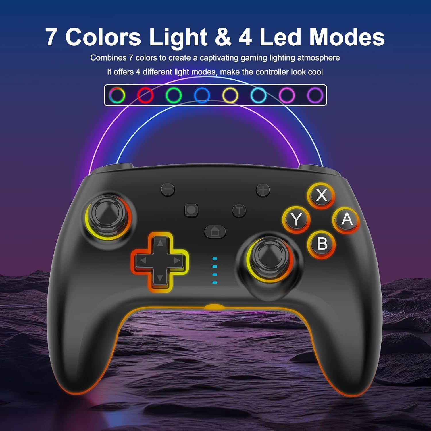 Wireless Controller for Switch/Switch 2/Lite/OLED/PC, Switch Pro Controller with 7 Colour Changing RGB Lighting/Dual Vibration/6 Axis Gyroscope/Turbo, Ergonomically Designed Precise Gamepad