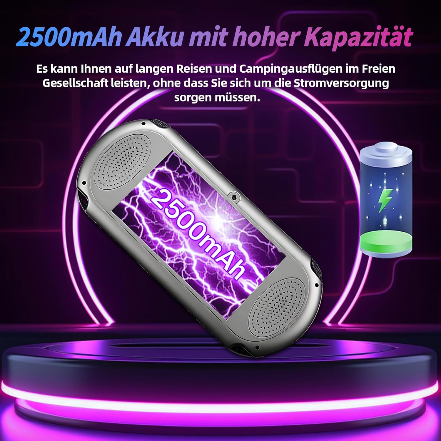 7,1 Zoll 16 Millionen Farben HD Augenfreundlicher großer Bildschirm: Der 7,1 Zoll große Bildschirm der tragbaren Spielekonsole bietet 36 % mehr Sichtfläche als herkömmliche Spielekonsolen-Bildschirme, präsentiert 16 Millionen lebendige Farben und die 800 x 480 HD-Auflösung macht jedes Pixel klar und scharf. Das 16:9-Gold-Verhältnis ist perfekt auf klassische Spiele sowie Film- und Fernsehinhalte abgestimmt, sodass Sie sich von Bildschirmdehnungen und -verzerrungen verabschieden müssen. Dank der kratz- und sturzsicheren Eigenschaften schadet der Bildschirm Ihren Augen nicht, auch wenn Sie längere Zeit spielen. Bringen Sie ein atemberaubendes Spielerlebnis mit