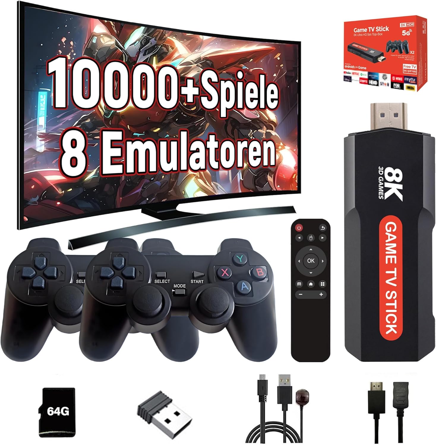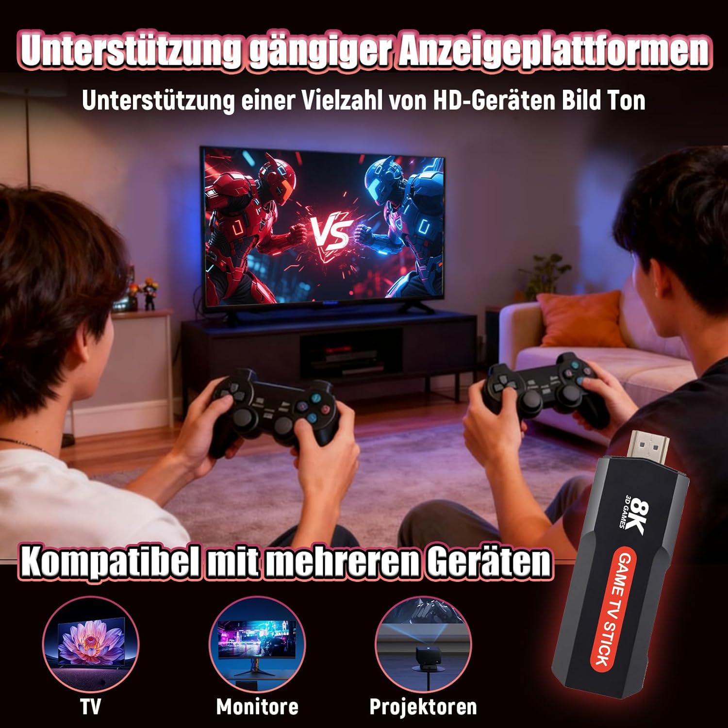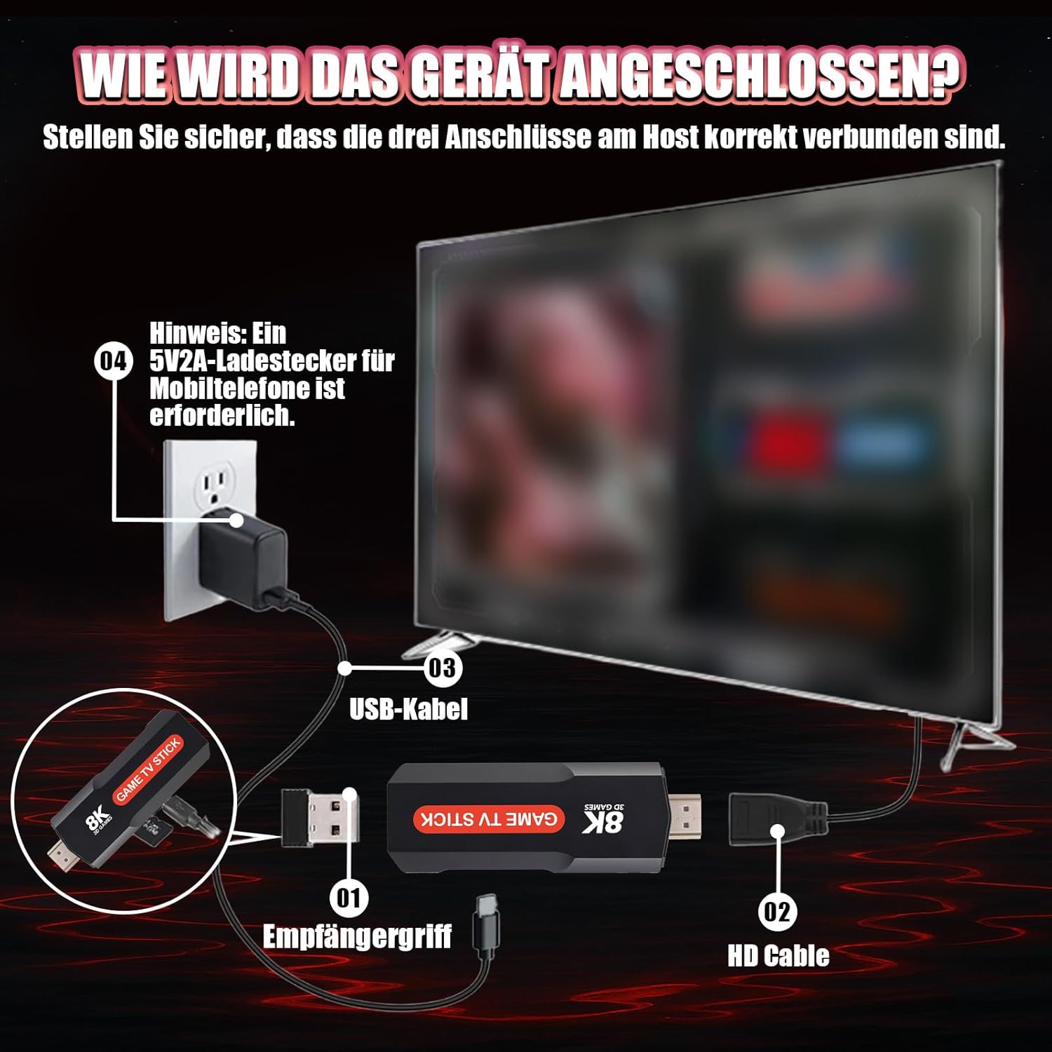 Umfangreiche Spielesammlung und einfache Plug-and-Play-Nutzung: Diese X2-Retro-Spielekonsole mit über 10.000 klassischen Spielen und 8 Emulatoren ist vorinstalliert. Da es sich um eine benutzerfreundliche Emulatorkonsole handelt, schließen Sie diesen Gaming-Stick einfach an Ihren Fernseher/Monitor an und schließen Sie das Netzkabel an. Einrichtungsschritte: 1. Schließen Sie den Stick an den HD-Anschluss Ihres Fernsehers an. 2. Verbinden Sie das Netzkabel mit einem 5V1A oder einem leistungsstärkeren Netzteil