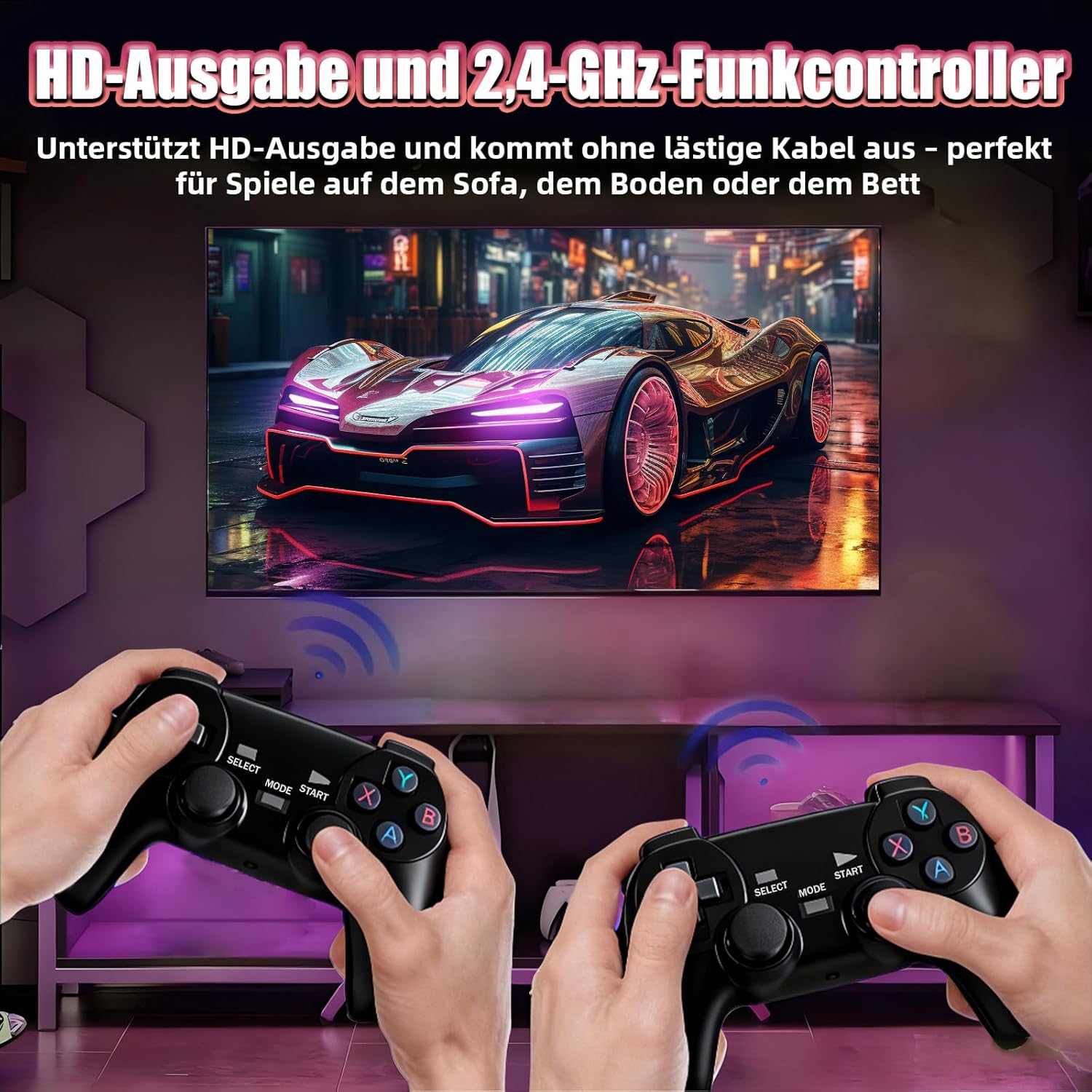 Klassisch gestalteter Gamecontroller: Diese Retro-Spielekonsole enthält zwei klassisch gestaltete 2,4-GHz-Wireless-Controller mit komfortablem Griff und präziser Steuerung, frei von störenden Kabeln. Ob auf dem Sofa, dem Boden oder im Bett – genießen Sie müheloses Gaming. (Hinweis: Batterien für den Wireless-Controller sind nicht im Lieferumfang enthalten)