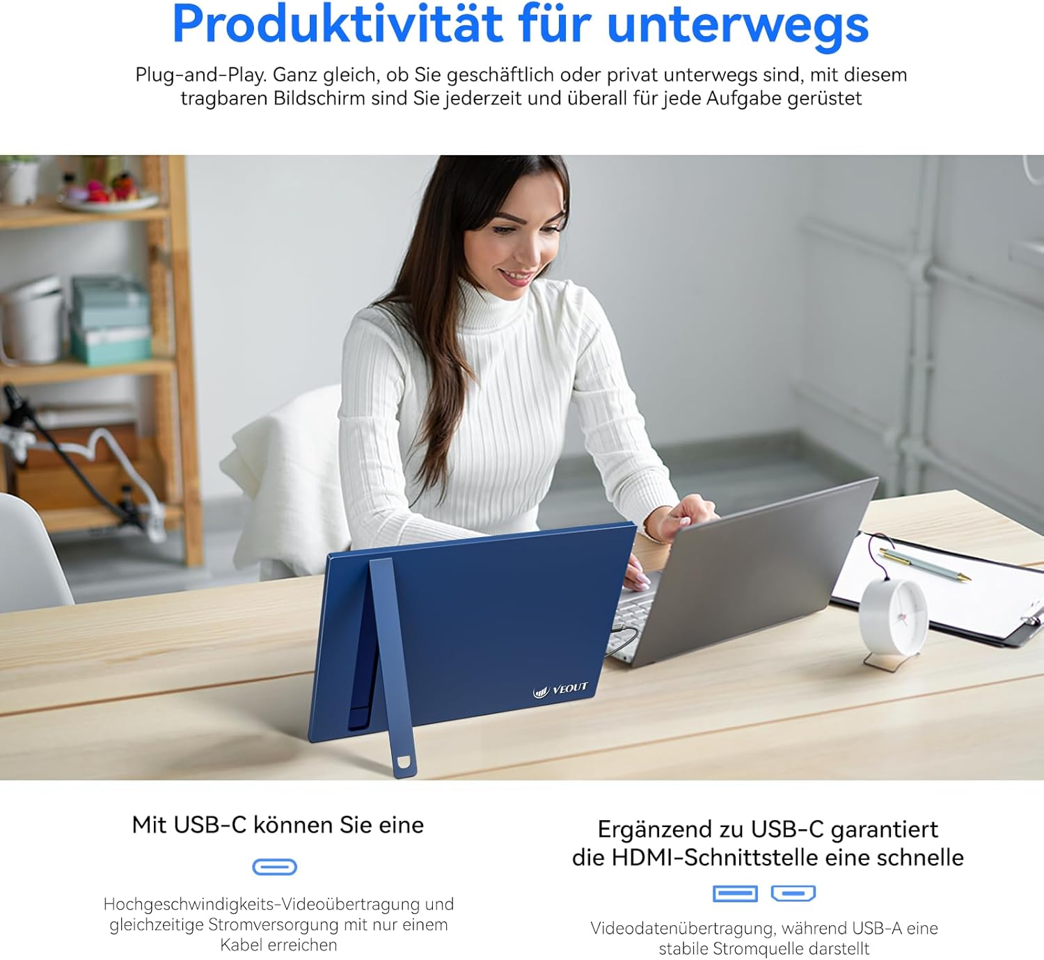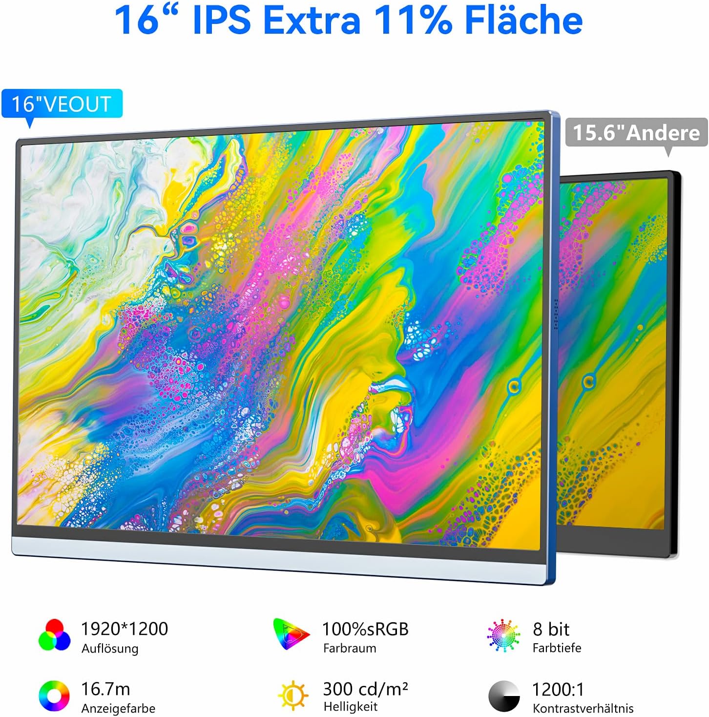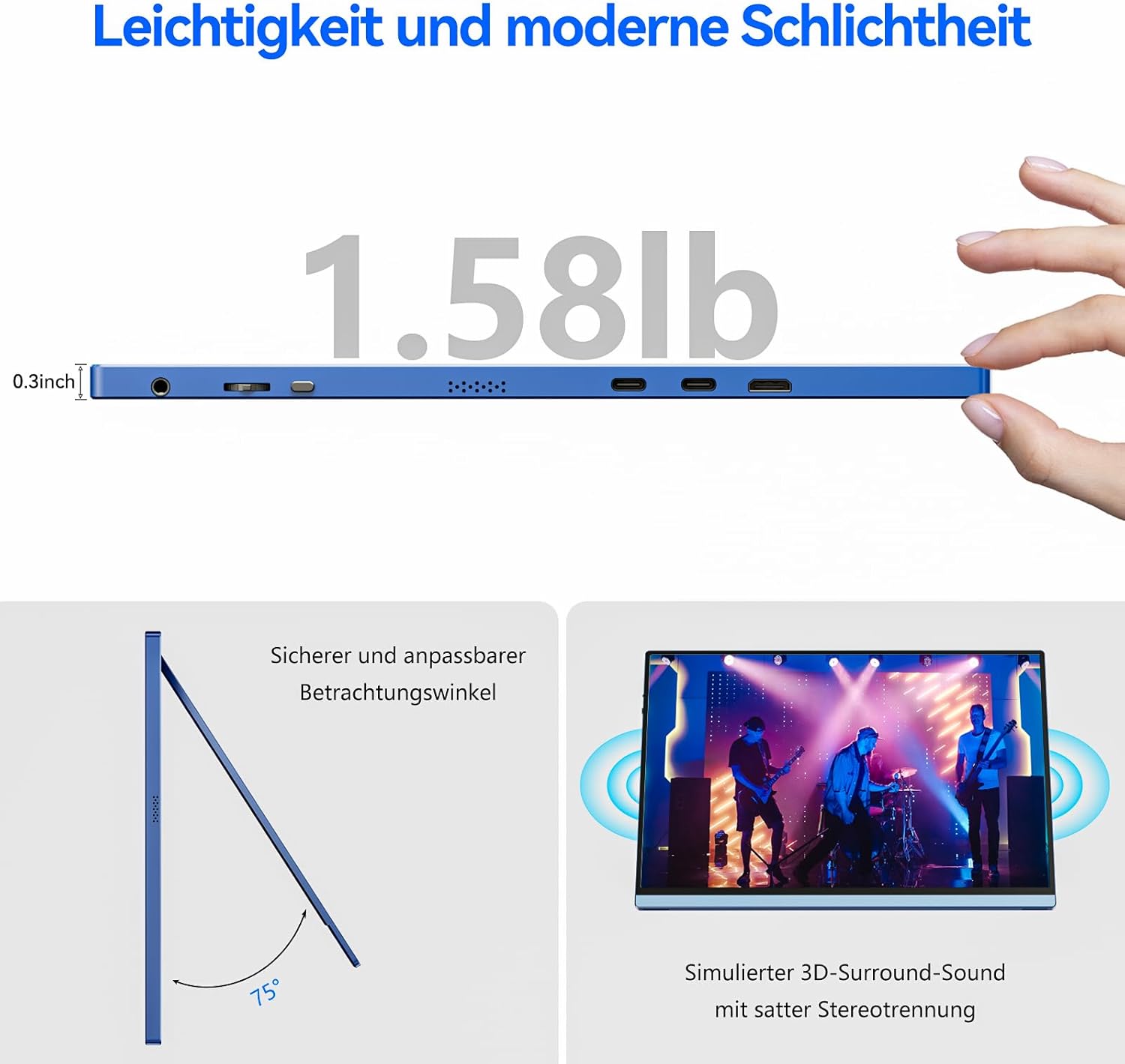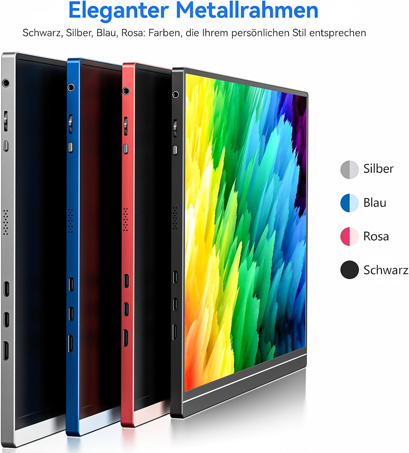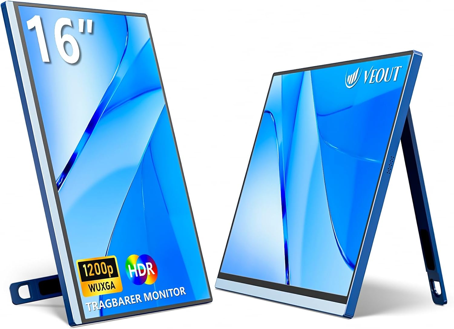 16 Zoll Portable Monitor, 1920*1200 FHD, IPS Tragebar Gaming Bildschirm für Laptop/PC/Mac/PS5/Xbox mit USB-C & HDMI, Ultradünn Display mit Halterung,16:10, 300cd/m² Helligkeit – Blau