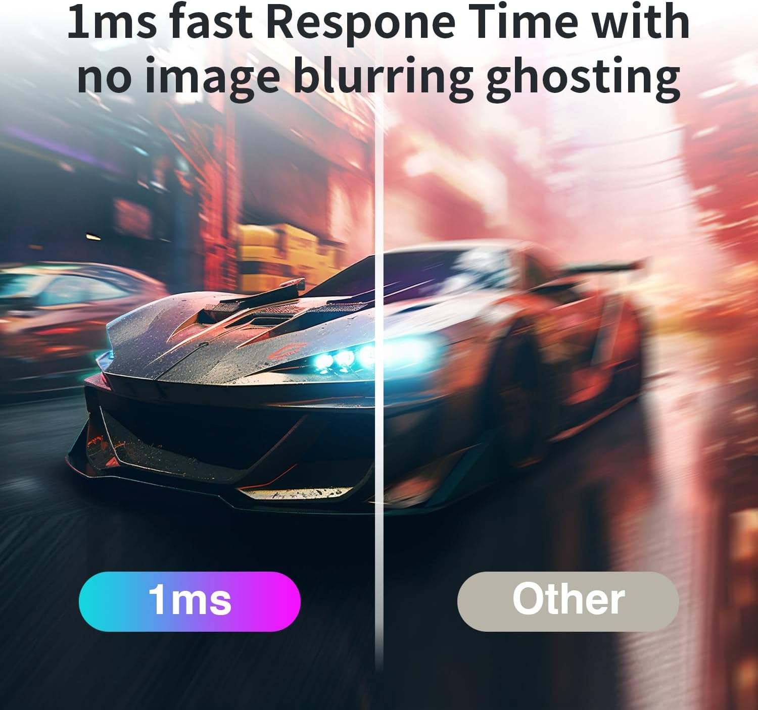 Technisches Diagramm, das die Visualisierung der Reaktionszeit von 1 ms mit Bewegungsunschärfevergleich auf violettem Hintergrund mit streifigen Lichteffekten zeigt.Technisches Diagramm, das die Visualisierung der Reaktionszeit von 1 ms mit Bewegungsunschärfevergleich auf violettem Hintergrund mit streifigen Lichteffekten zeigt.