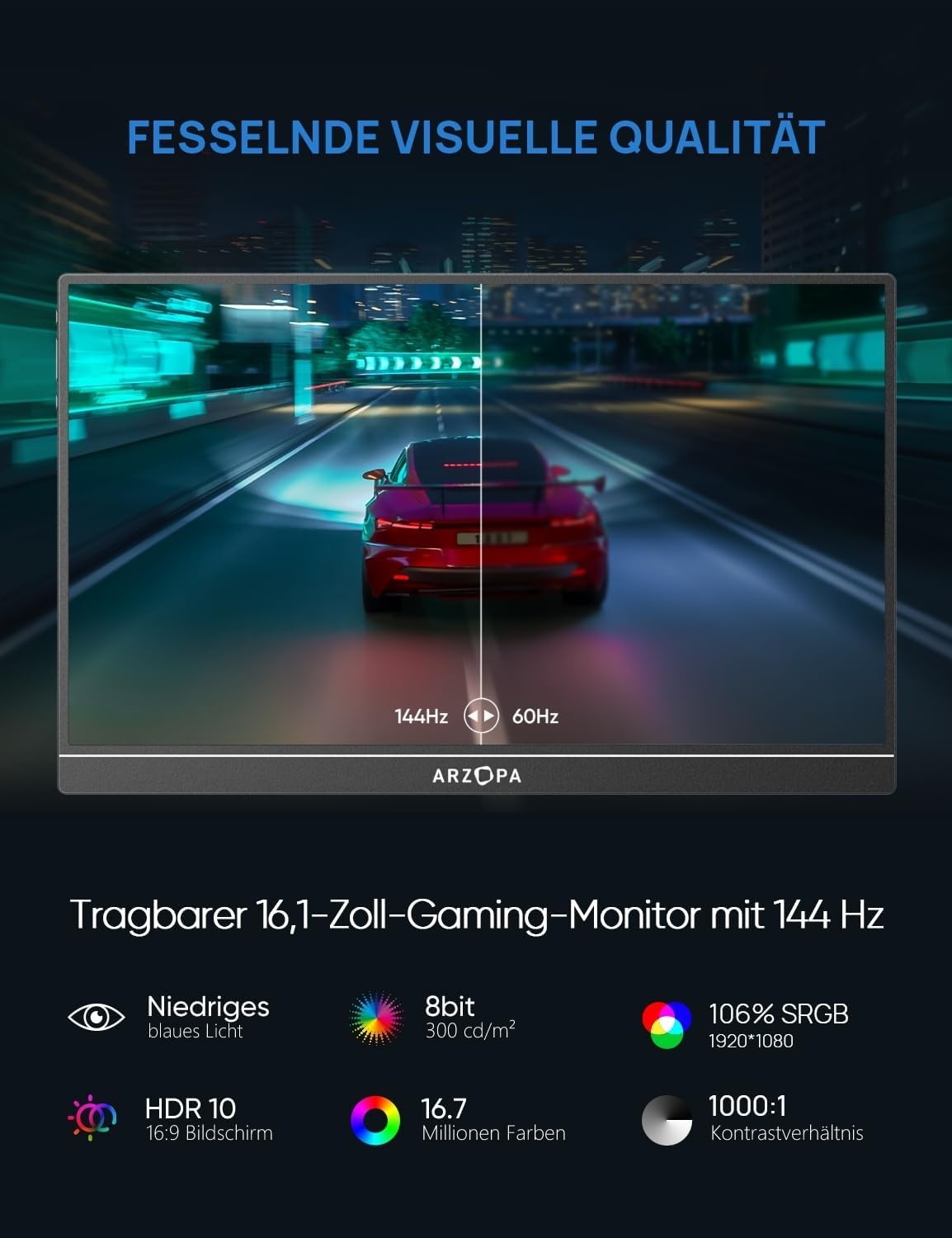 16,1 Zoll 144 Hz: Der tragbare Monitor ARZOPA Z1FC verfügt über eine ultrahohe Auflösung von 144 Hz für klarere Bewegungen und flüssigere Spielgrafiken.