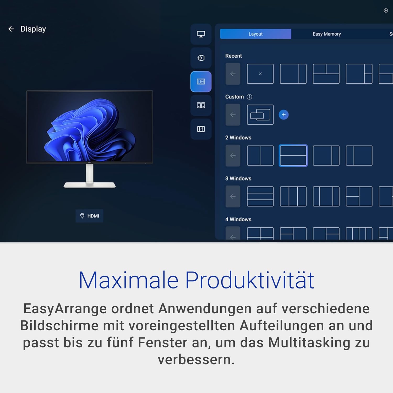 Maximale Produktivität: EasyArrange ordnet Anwendungen auf verschiedenen Bildschirmen mit voreingestellten Aufteilungen an und passt bis zu fünf Fenster an, um das Multitasking zu verbessern. Mit EasyArrange Memory können Sie Anwendungsprofile speichern und manuell, nach Zeitplan oder beim Starten wiederherstellen.