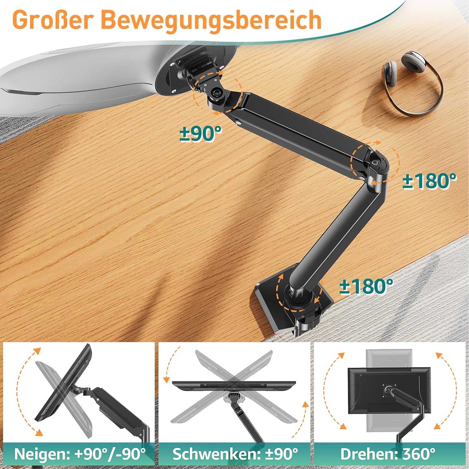 Voller Bewegungsspielraum und mehr Komfort – Die Einzelmonitorhalterung bietet einen größeren Bewegungsspielraum: Der Bildschirm kann um 90° nach oben/unten geneigt, um 180° geschwenkt und um 360° vom Quer- in den Hochformatmodus gedreht werden. Der flexible Gasfederarm kann bis zu 551 mm lang und bis zu 500 mm hoch sein. So finden Sie ganz einfach eine optimale ergonomische Haltung.