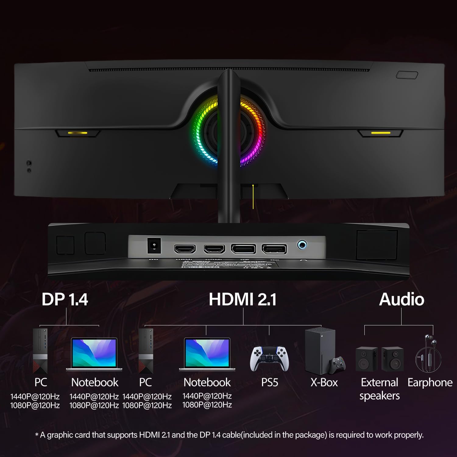 Erleben Sie nahtlose Konnektivität mit DisplayPort 1.4 und HDMI 2.1 Anschlüssen. Verbinden Sie Ihren Laptop, Mac, Tablets und Spielkonsolen mit diesem ultra-breiten gebogenen Monitor für ein eindringliches Betrachtungserlebnis.