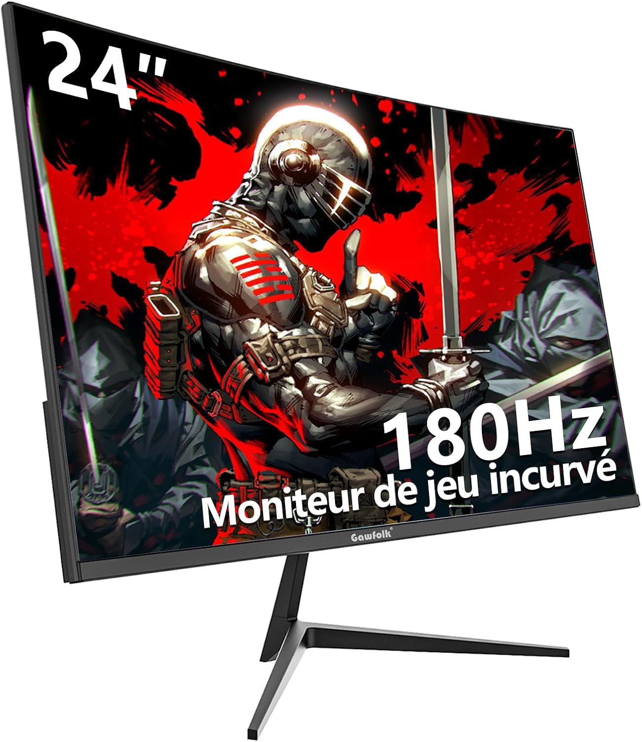 Gawfolk PC Screen, 24 Inches, Curved Gaming Monitor, 180 Hz, FHD, 1080p, 1 ms, Frameless, FreeSync, 100% sRGB, 178° Viewing Angle, HDMI, DisplayPart, Compatible with VESA 75 x 75 mm, Black