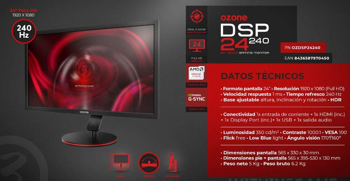 Ozone Gaming DSP24 240 Gaming Monitor, 1920 x 1080 Full HD Monitor Display, 24 Inch, Solid Base, 1ms, 240Hz, Freesync, HDR, HDMI, Black