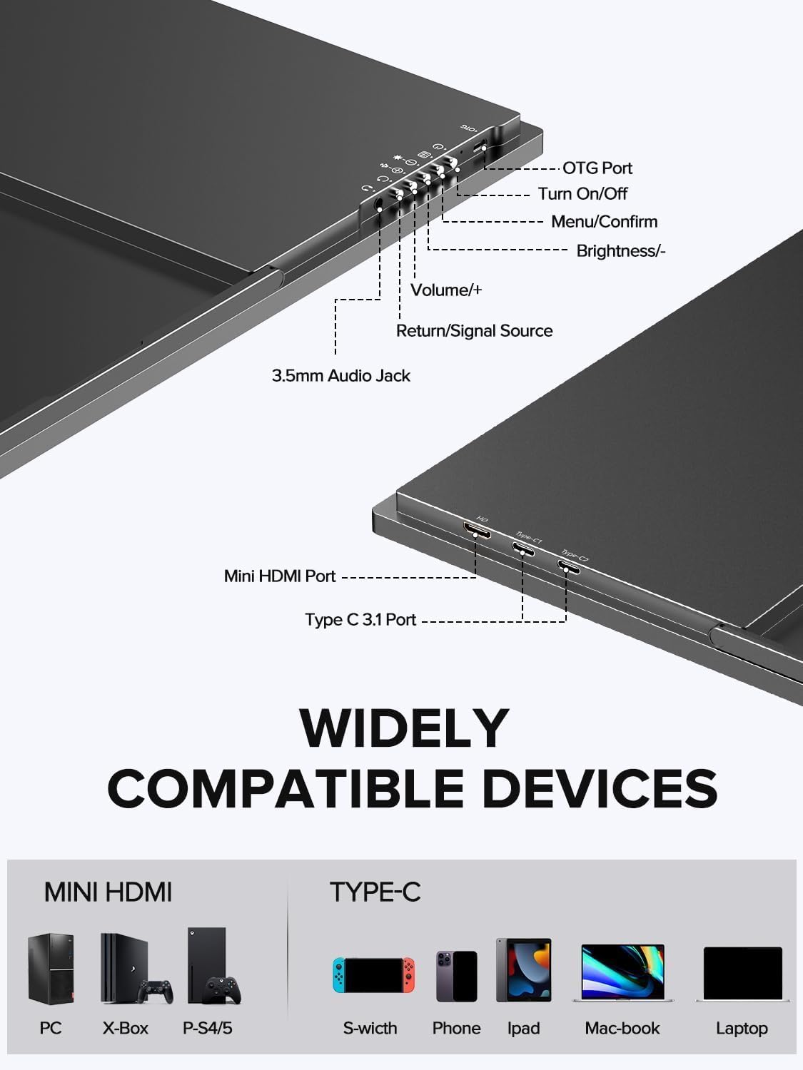 Plug-and-Play, hohe Kompatibilität: Keine Treiber erforderlich. Ausgestattet mit 2 voll funktionsfähigen Typ-C-Anschlüssen und 1 Mini-HDMI-Anschluss; löst das Problem von Kabelsalat; kompatibel mit verschiedenen Geräten wie Laptops, PCs, Mobiltelefonen und Spielekonsolen. Es kann den Laptop-Bildschirm erweitern, die Arbeitseffizienz verbessern, den Bildschirm des Mobiltelefons spiegeln, eine größere Anzeige bereitstellen und unterstützt auch verschiedene Spielekonsolen für Spiele.