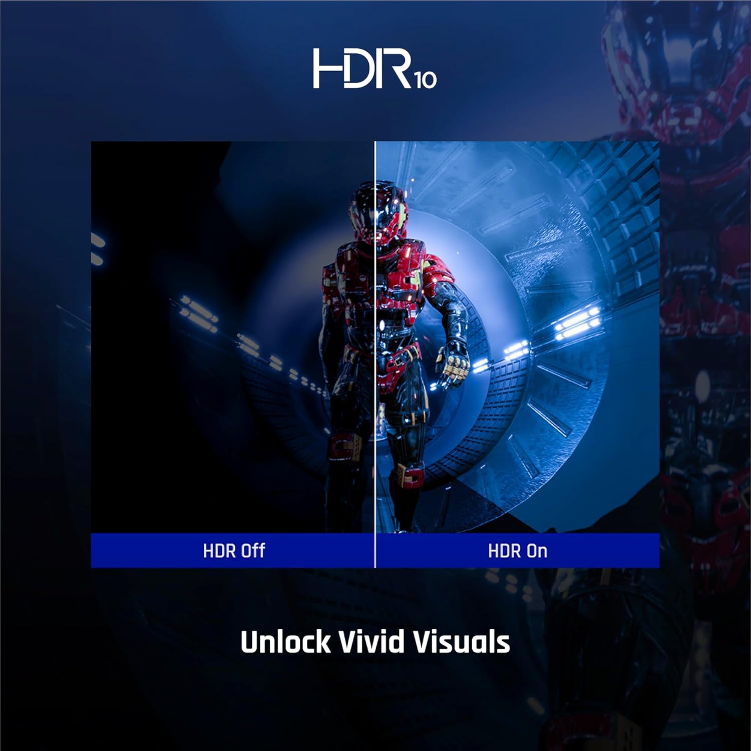 SEHEN SIE ÜBER DAS ÜBLICHE hinaus: Bringen Sie Ihr Seherlebnis mit der HDR10-Technologie auf ein ganz neues Niveau. Es erhellt Spielwelten mit lebendigen Details und reproduziert sie mit tieferen Schwarztönen, helleren Weißtönen und einer erweiterten Farbpalette, die ein faszinierend realistisches Bild erzeugt.