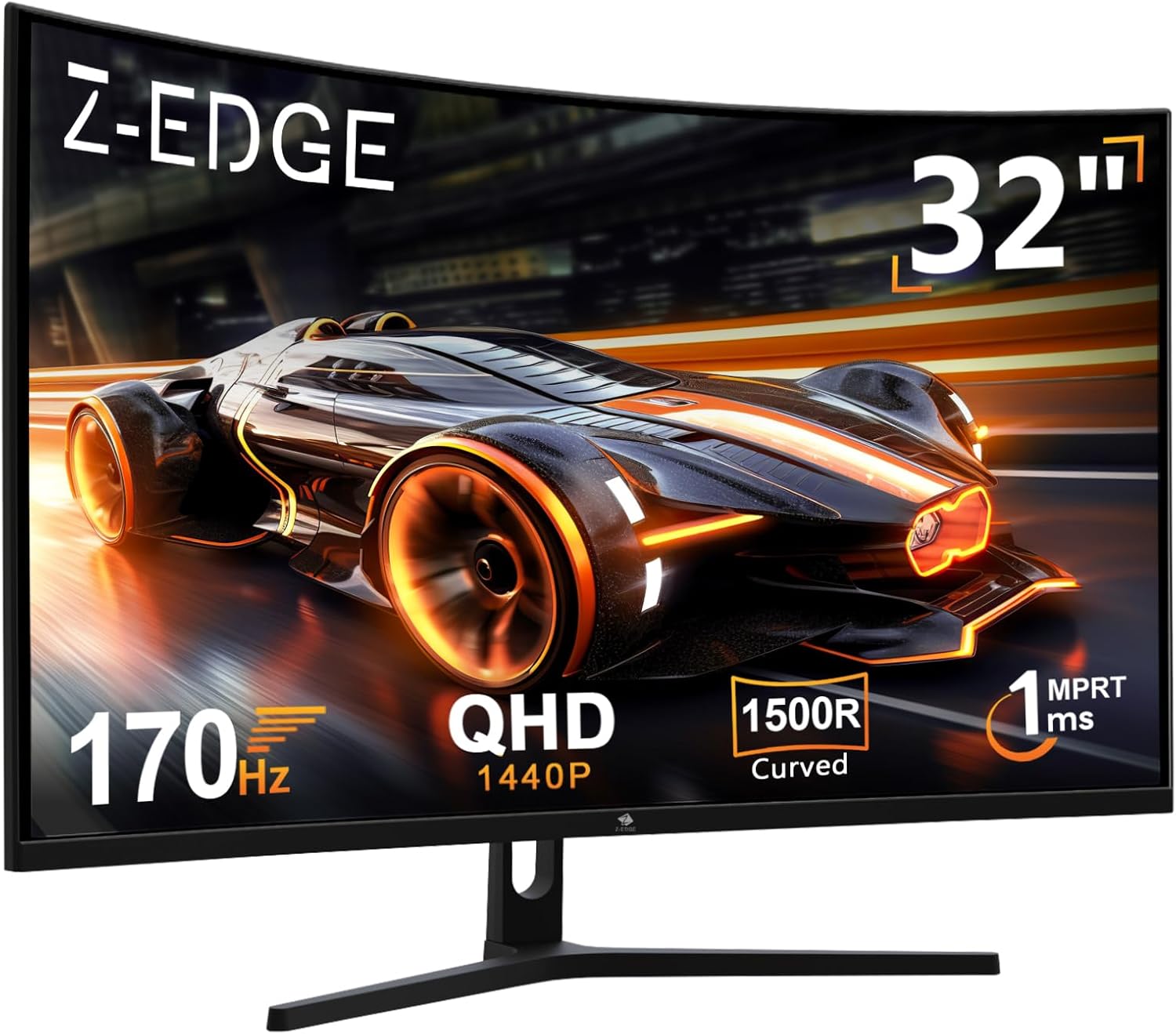 Z-Edge 32 Inch QHD Curved Gaming Monitor 165Hz 1ms MPRT 2K 2560×1440 16:9 VA 1500R Curved Screen, 280cd/m² Brightness, FreeSync, DisplayPort (165Hz) & HDMI (144Hz), Black