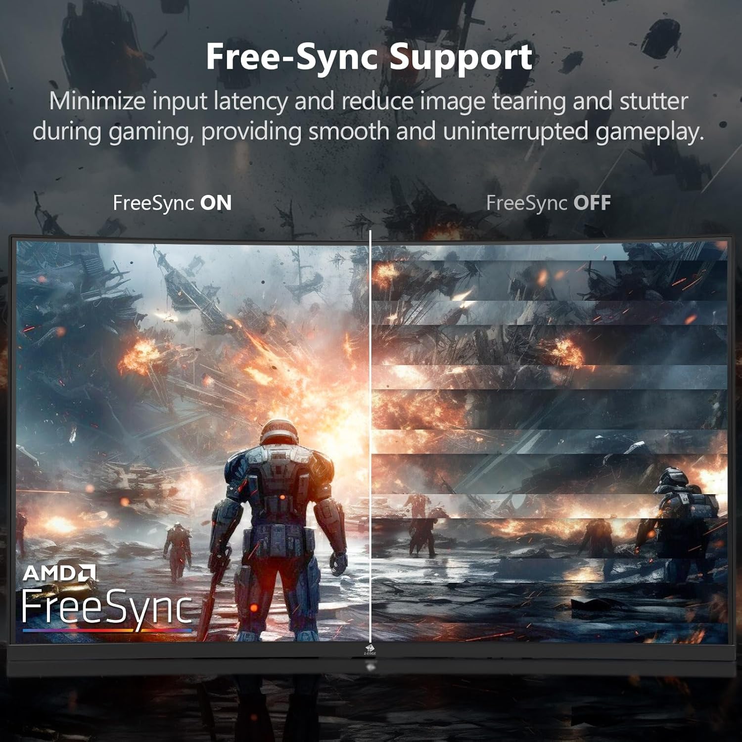 1500R gebogener Bildschirm – Dieser Gaming-Monitor verfügt über einen gebogenen 32-Zoll-Bildschirm, der ein beeindruckendes Spiel- und Videowiedergabeerlebnis bietet, sodass Sie in das Spiel eintauchen und sich auf den Inhalt konzentrieren können. Die FreeSync-Technologie kann Bildschirmrisse, Ruckeln und Eingabeverzögerungen beseitigen und Ihnen ein außergewöhnliches Spielerlebnis bieten.