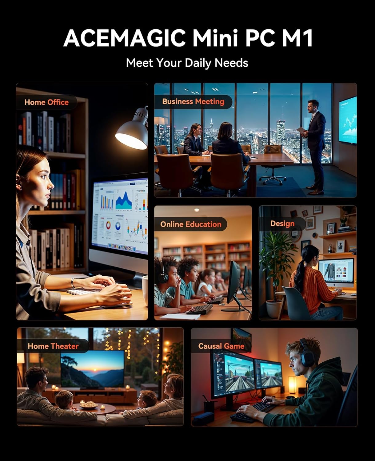 Kompakt und vielseitig: Sie suchen eine platzsparende Desktop-Lösung? Der ACEMAGIC Mini-PC überzeugt mit einem eleganten, kompakten Gehäuse (12,8 × 12,8 × 4,1 cm), das nur minimalen Platz benötigt. Mit der mitgelieferten VESA-Halterung kann es einfach hinter einem Monitor, unter dem Tisch oder an der Wand montiert werden, um sich nahtlos an jede Umgebung anzupassen und für einen aufgeräumten, ergonomischen Arbeitsplatz zu sorgen.