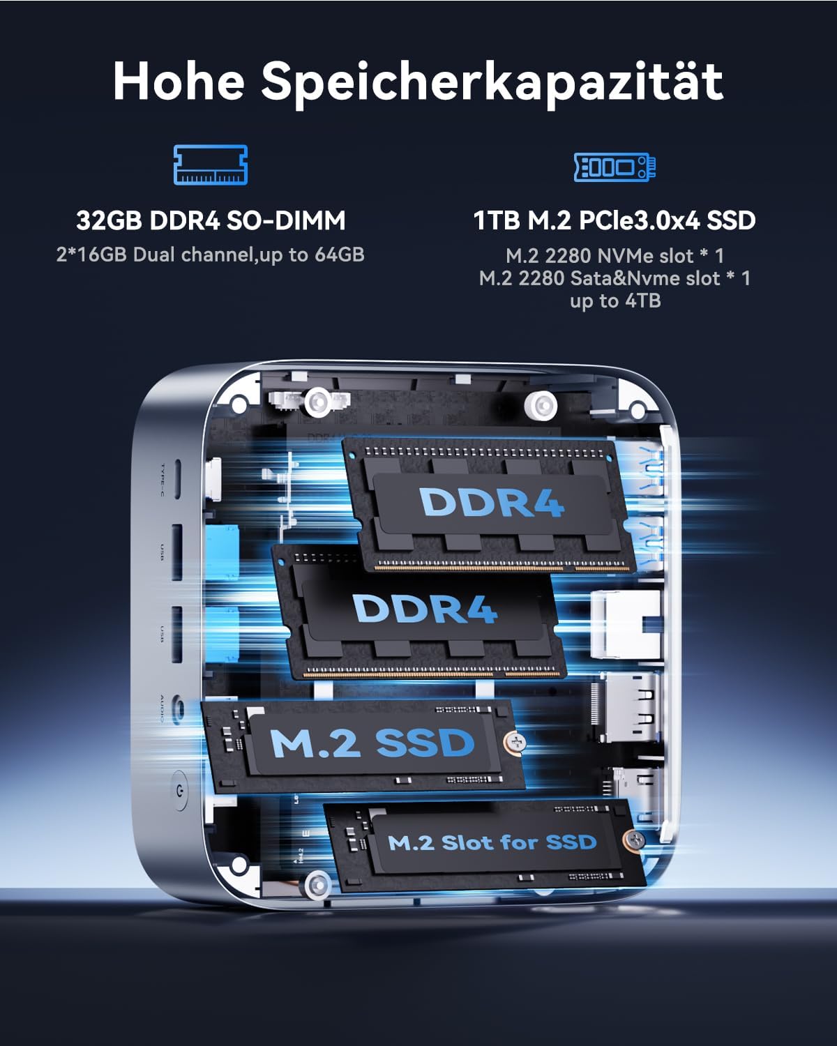 Arbeitsspeicher und Speichererweiterung: Der Mini-Computer ist ab Werk mit 32 GB DDR4-RAM ausgestattet und kann auf bis zu 64 GB (2 x 32 GB) erweitert werden. Als Primärspeicher dient eine 1TB M.2 PCIe SSD. Dieser M.2-Steckplatz unterstützt SSDs mit bis zu 2 TB Kapazität. Der optionale Speicherplatz kann mit einer zusätzlichen 2,5-Zoll-SATA-SSD (separat erhältlich) erweitert werden.