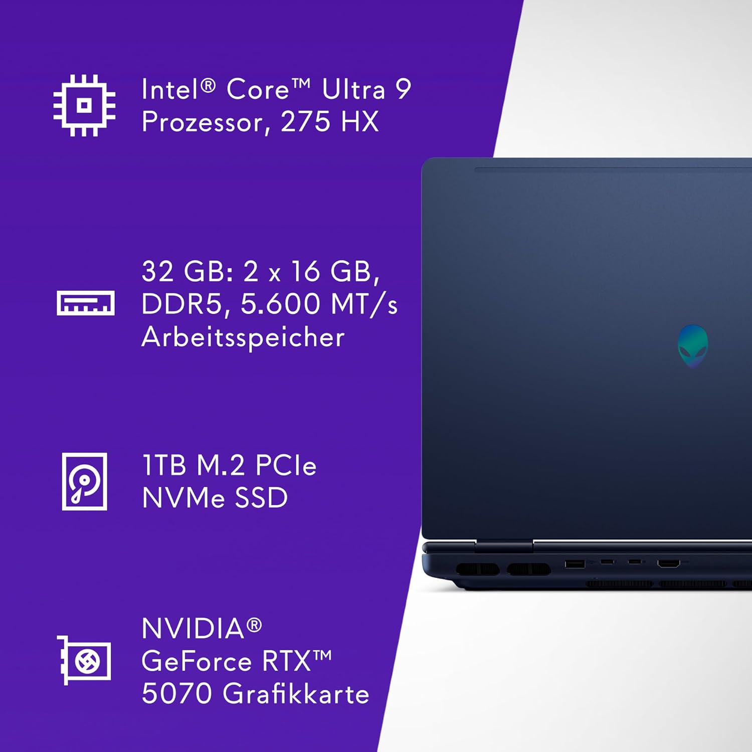 Alienware 16 x Aurora Gaming Laptop AC16251 16 Inch WQXGA 240Hz G-Sync Display, Intel Core Ultra 9 275HX Series 2, Nvidia Geforce RTX 5070, 32GB RAM, 1TB SSD, Windows 11 Home, AlienFX RGB QWERTZ