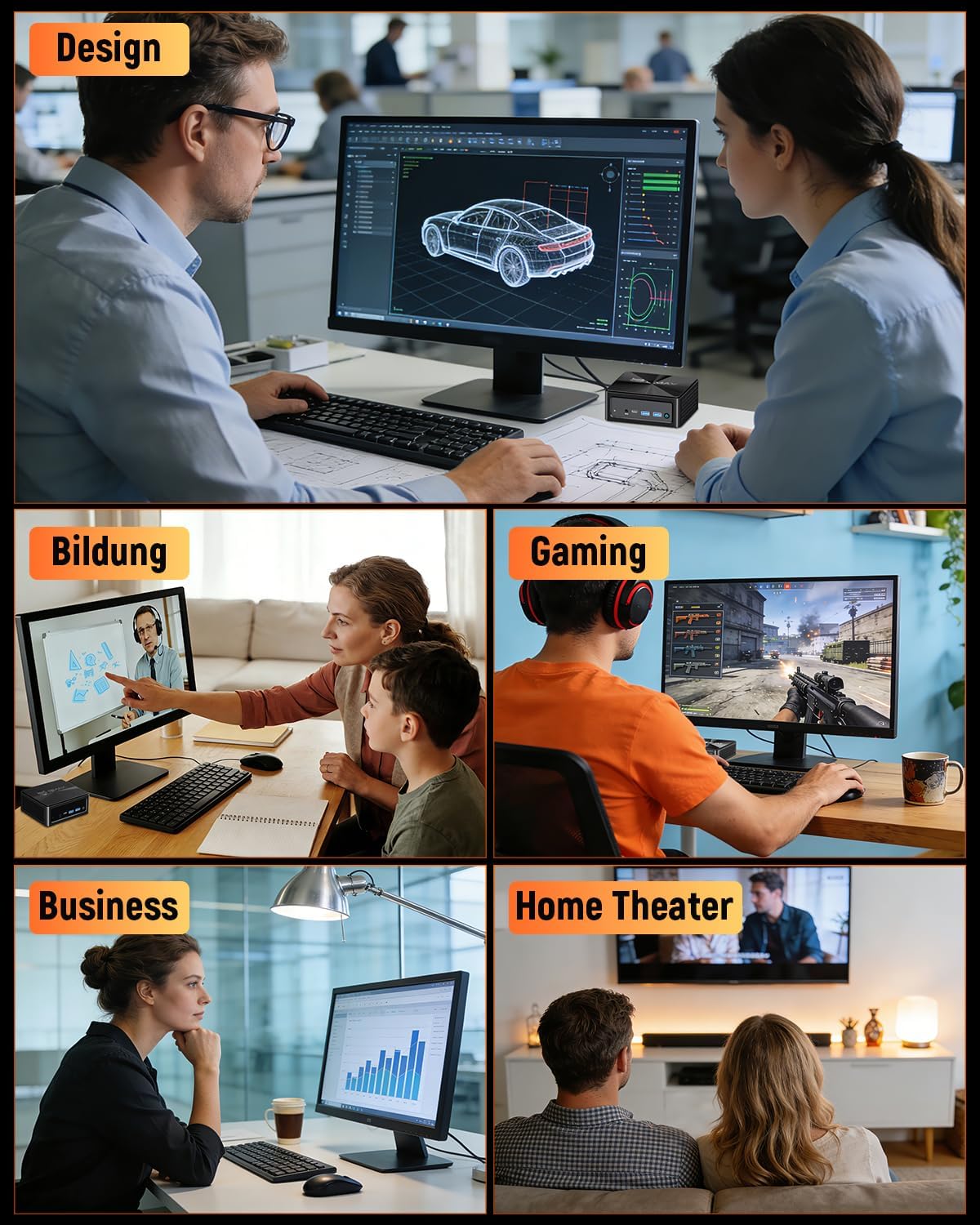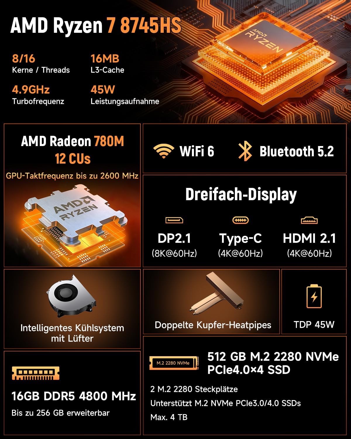 Leistungsstarker Gaming- und Multitasking-Mini-PC mit Ryzen 7 8745HS: Dieser kompakte Mini-PC wird vom modernen AMD Ryzen 7 8745HS (8 Kerne/16 Threads, bis zu 4,9 GHz) angetrieben und ist somit die perfekte All-in-One-Lösung – ob als schneller Computer-PC fürs Büro, als leistungsstarker Gaming-PC für zu Hause oder zuverlässiger Partner. .