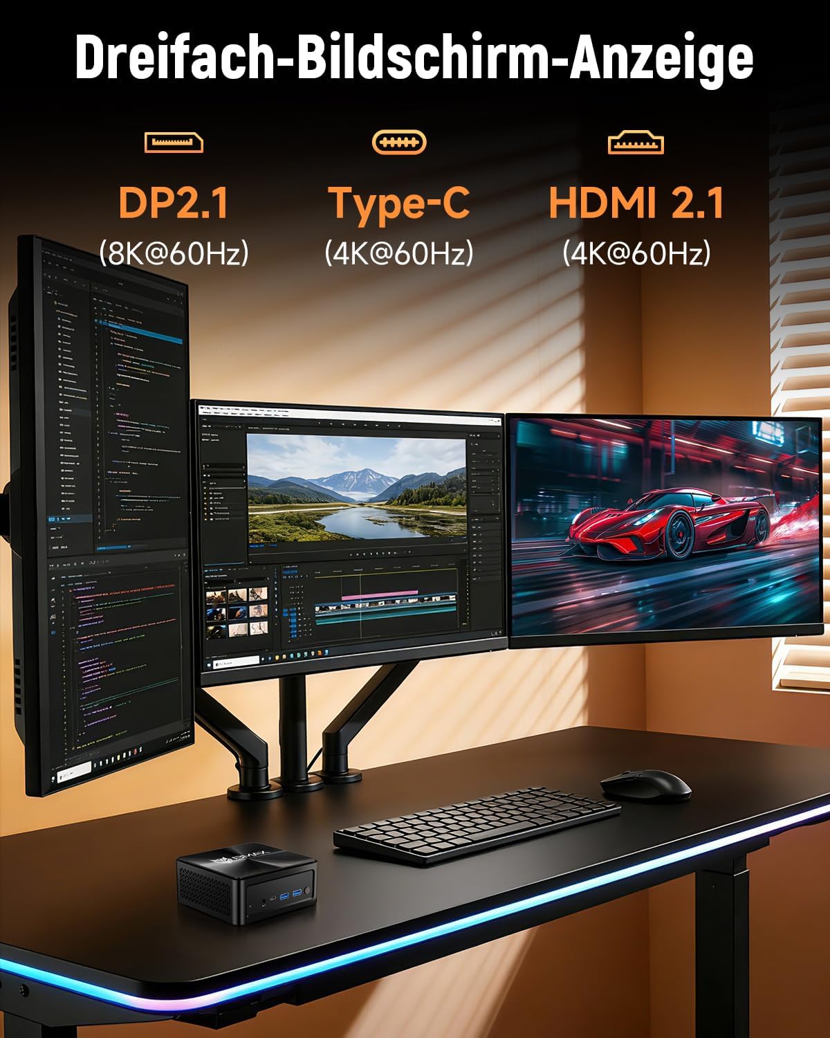 Hochtaktende Grafikeinheit und Triple-Display: Die integrierte AMD Radeon 780M GPU erreicht einen maximalen Boost-Takt von bis zu 2,6 GHz und liefert so beeindruckende Grafikleistung für Spiele und kreative Anwendungen. Mit drei unabhängigen Videoausgängen – DisplayPort 2.1 (8K@60Hz), HDMI 2.1 (4K@60Hz) und USB-C in voller Größe (4K@60Hz) – ist dieser Desktop-PC im Handumdrehen als effizientes Dreifach-Monitor-Setup für Büro oder Gaming eingerichtet.