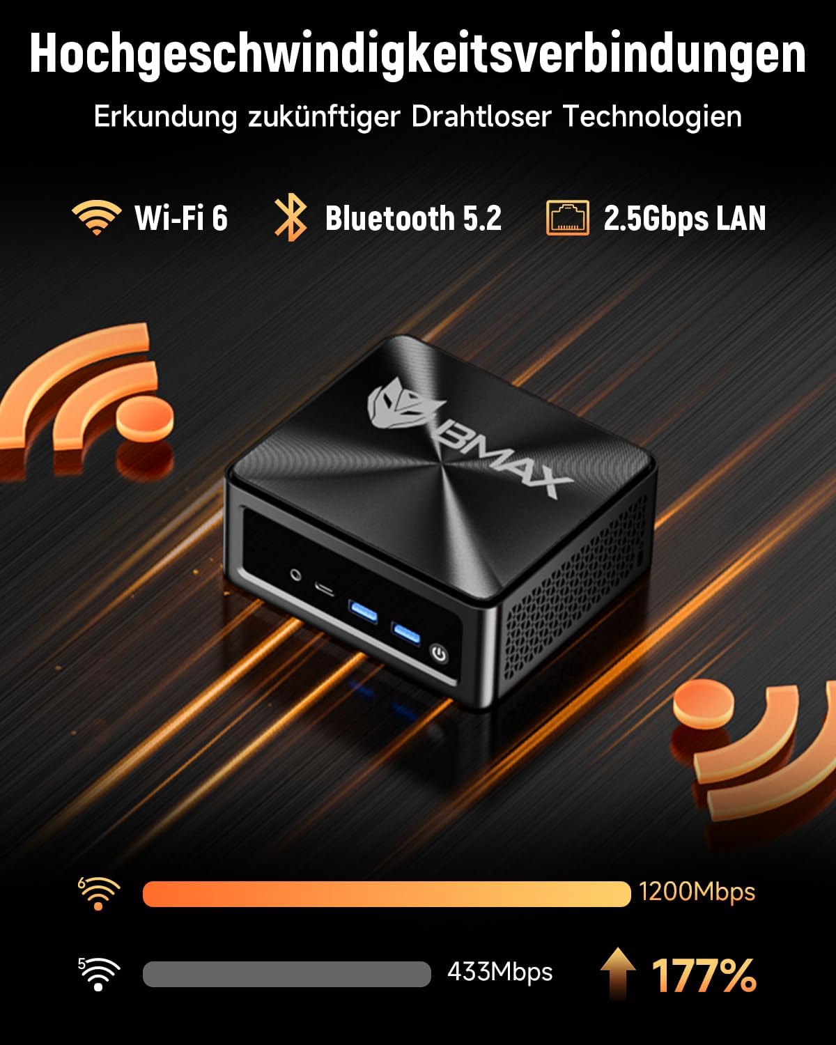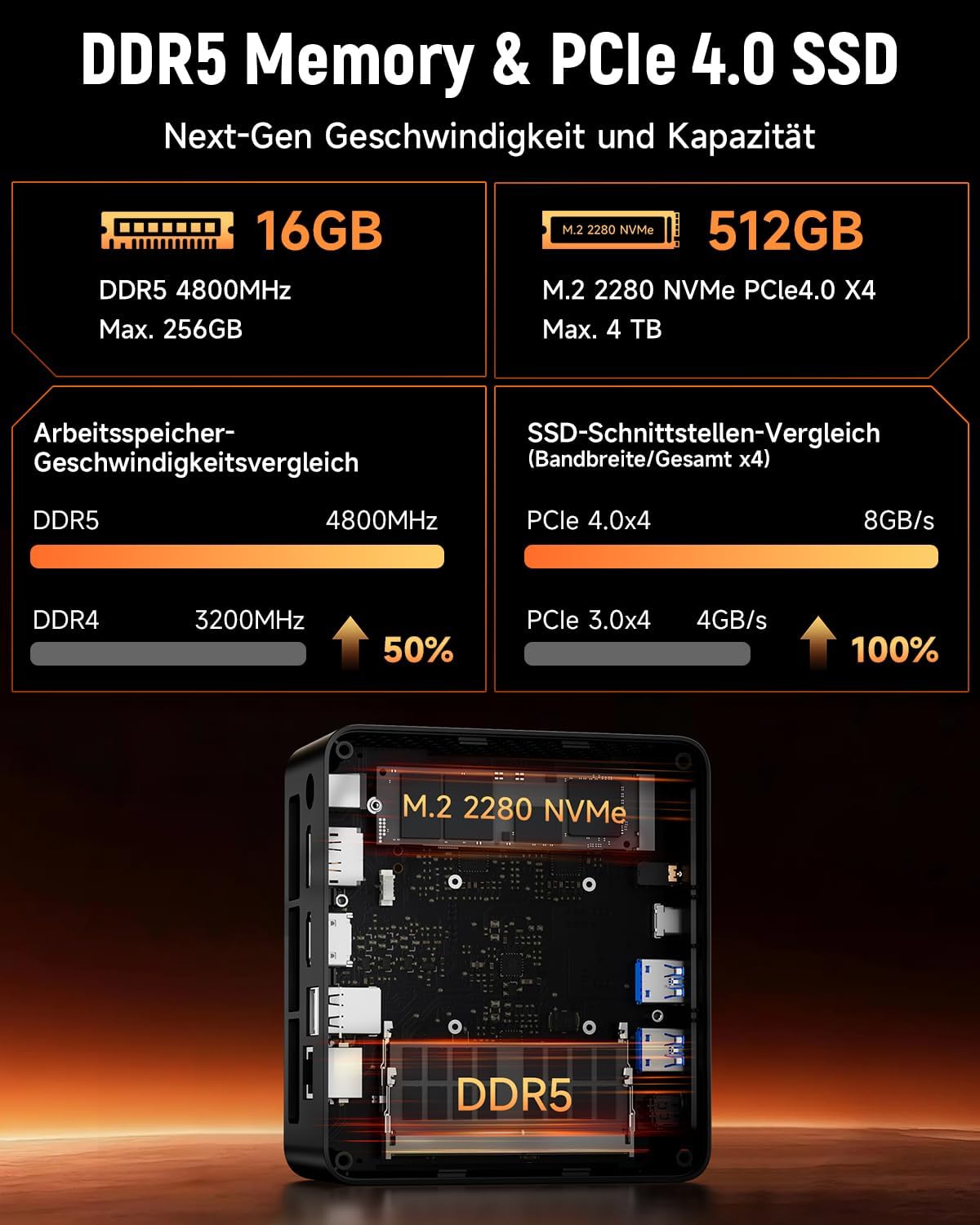 16 GB DDR5 und 512 GB NVMe SSD: Der BMAX B8A Pro Mini-PC bietet 16 GB schnellen DDR5-RAM (4800 MHz) mit bis zu 50 % höherer Bandbreite als DDR4 für ultimative Reaktionsfähigkeit. Zwei Steckplätze ermöglichen ein Upgrade auf bis zu 256 GB. Dieser Desktop-Computer enthält eine 512 GB PCI-e 4.0×4 NVMe SSD mit bis zu 100 % höherer Geschwindigkeit im Vergleich zu PCI-e 3.0. Ein zusätzlicher M.2 2280 PCI-e 3.0×4 Steckplatz ermöglicht eine Speichererweiterung auf bis zu 4 TB.