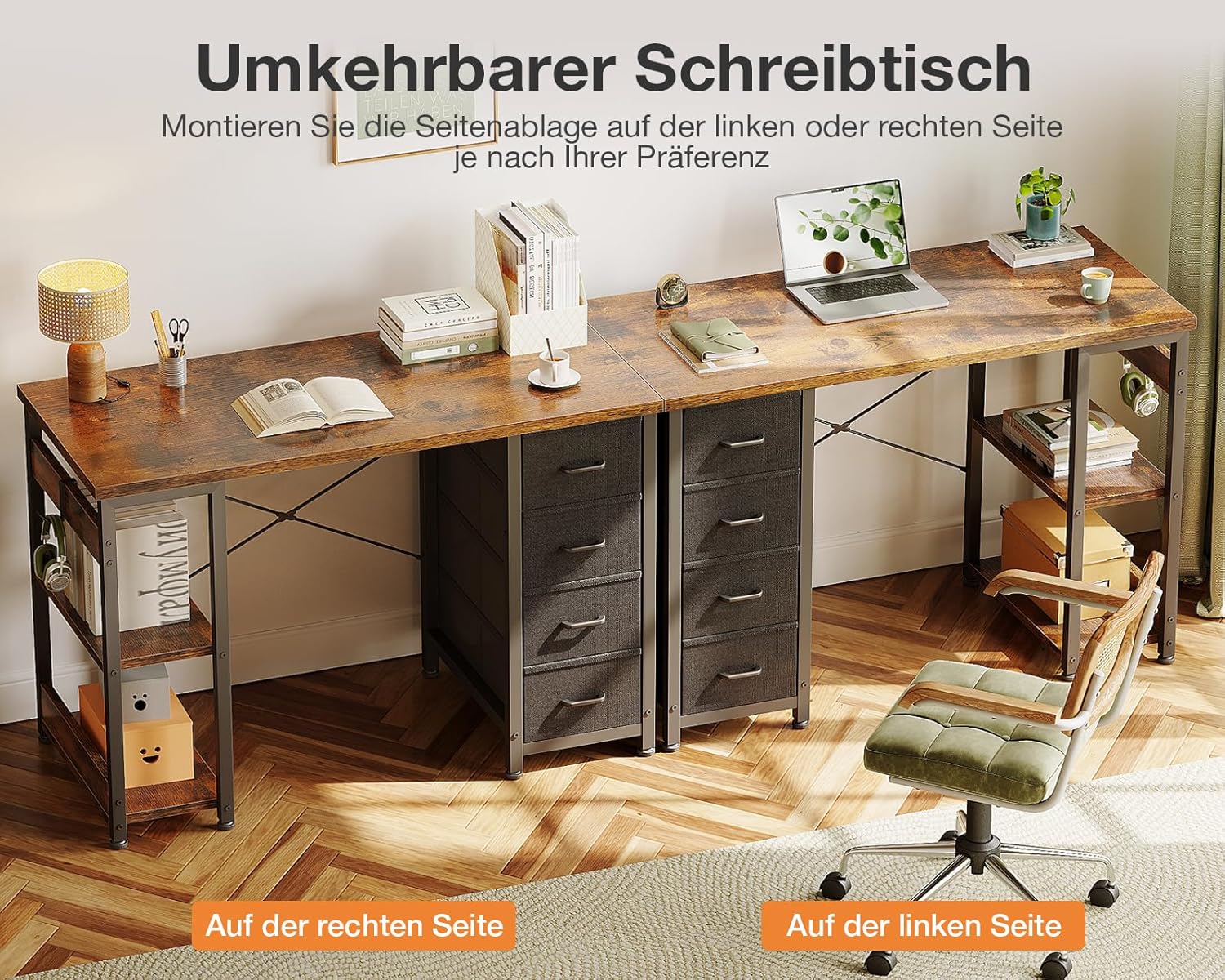 Reversibles Design für flexible Installation: Platzieren Sie diesen Schreibtisch mit Schublade entweder links oder rechts und passen Sie seine Konfiguration an Ihren Raum an. Dieses modulare Design schafft einen personalisierten und effizienten Arbeitsbereich und gibt Ihnen die Freiheit, Ihre wichtigsten Utensilien nach Ihren Wünschen zu organisieren.