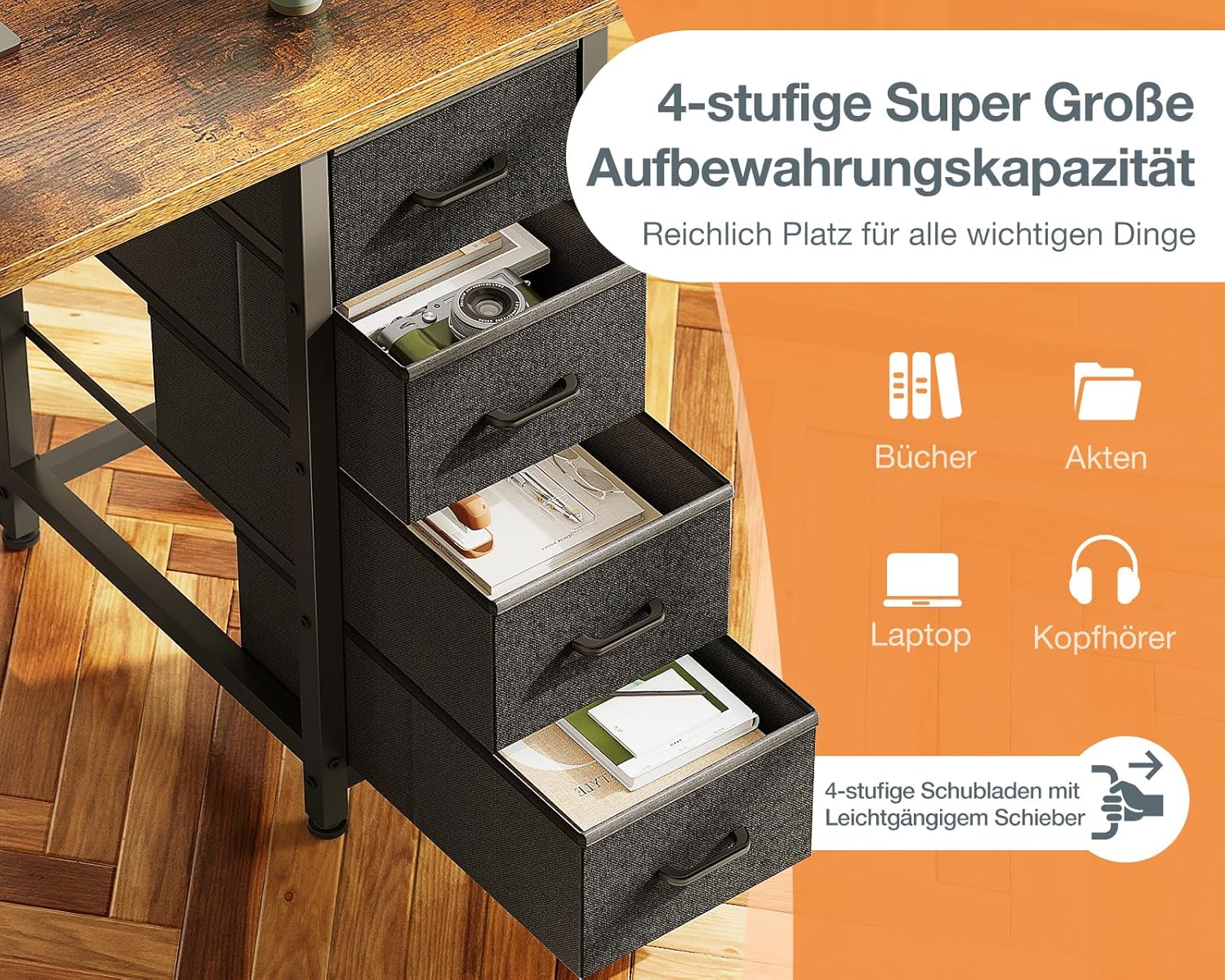 Großer Stauraum mit 4 Schubladen: Dieser Schreibtisch verfügt über 4 geräumige Schubladen, die viel Stauraum für Ihre wichtigsten Utensilien bieten. Ideal, um Ihr Wohnzimmer, Schlafzimmer oder Büro organisiert und aufgeräumt zu halten.