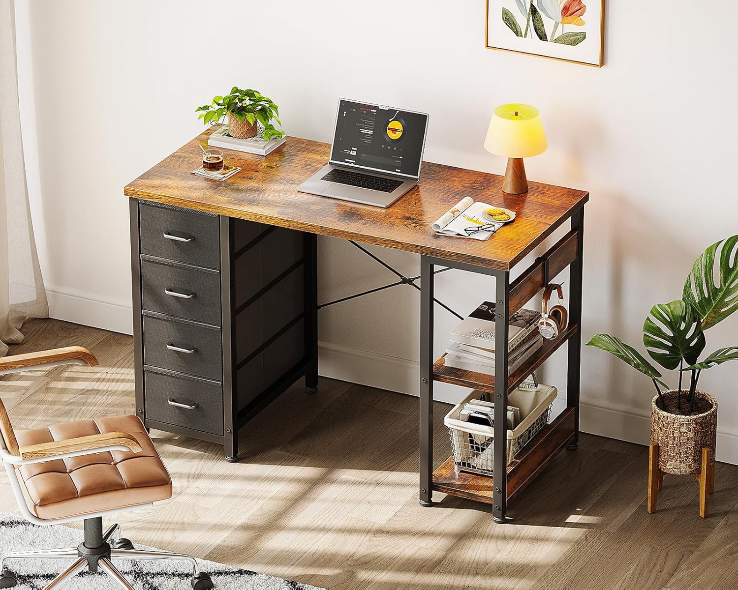 Coleshome Small Desk with 4 Drawers, 100 x 40 cm Desk with Storage Space, Reversible Computer Desk with Shelves, PC Table for Office, Study, Bedroom, Brown