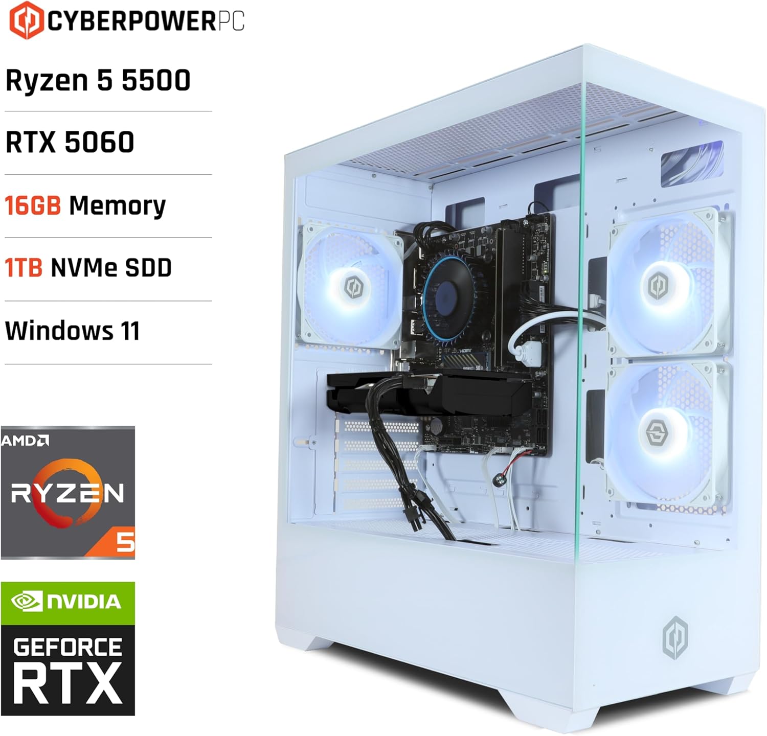 CYBERPOWERPC Wyvern Gaming PC – AMD Ryzen 5 5500, Nvidia RTX 5060 8GB, 16GB RAM, 1TB NVMe SSD, 650W 80+ PSU, Wi-Fi, Windows 11, Prism Panoramic RGB White