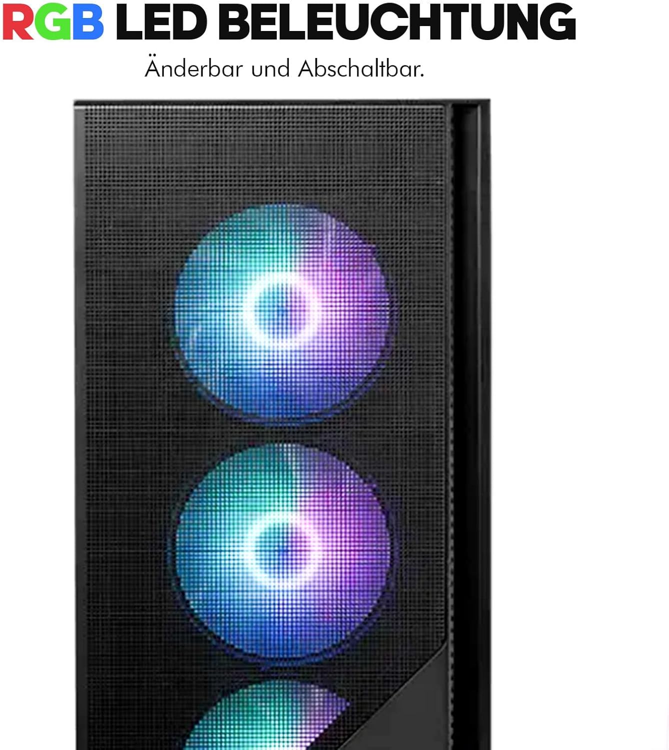 Individuelle Farbgestaltung möglich – das Gehäuse ist schwarz mit RGB-Beleuchtung, sowie vier RGB-LED-Lüftern. Über die RGB-Steuerung am PC kann die Beleuchtung verändert oder ausgeschaltet werden