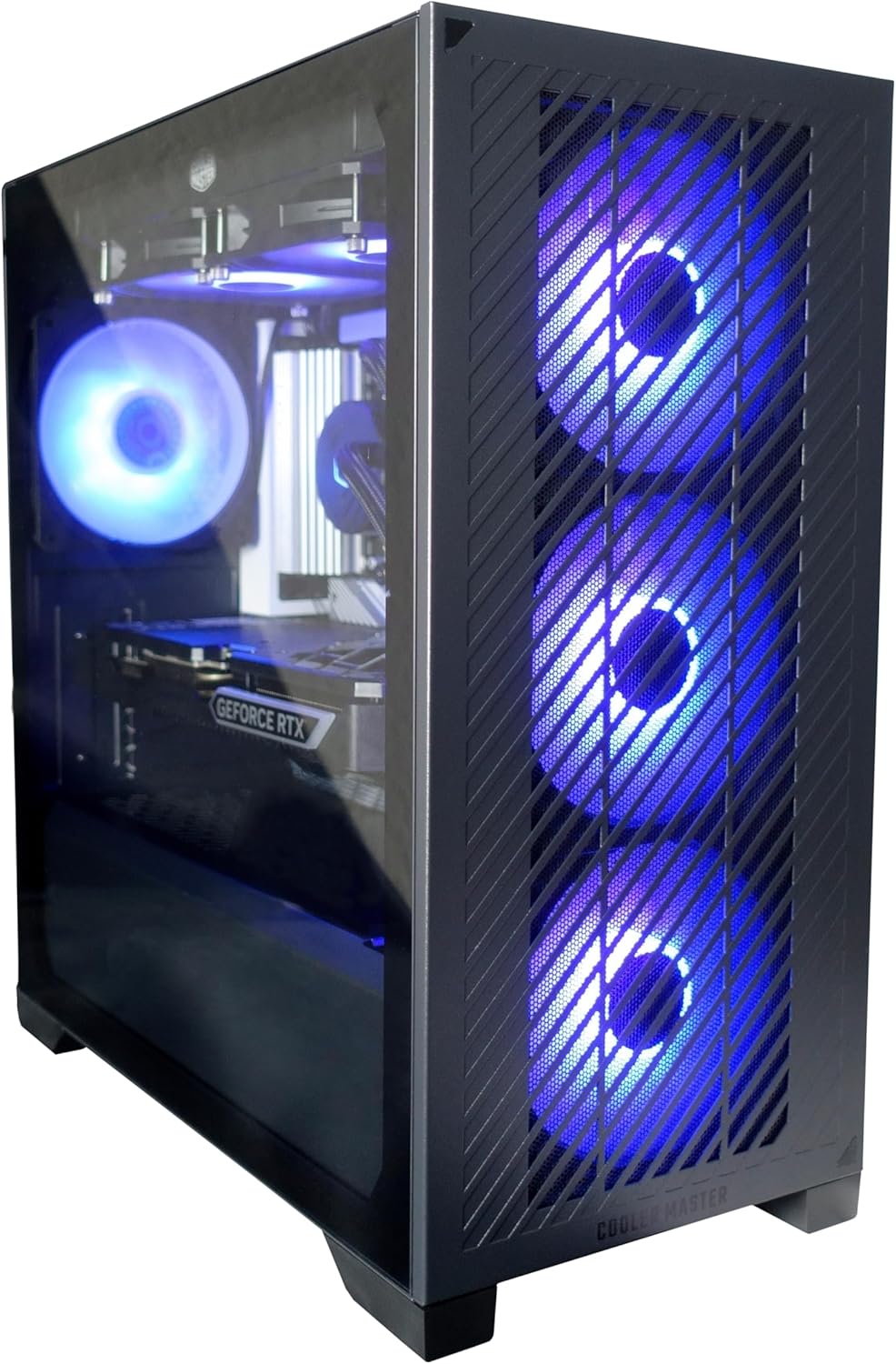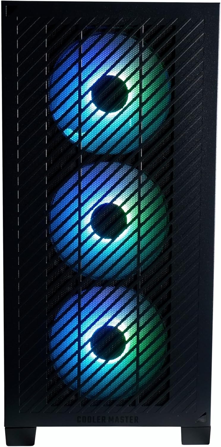 This PC combines high performance with a modern design. The chassis with glass window and individually adjustable RGB lighting provides an attractive look, while optimized cooling allows efficient and quiet performance. Four 120mm case fans and powerful 240mm CPU water cooling with two 120mm RGB fans keep temperatures low and noise levels minimal, even under the strongest loads.